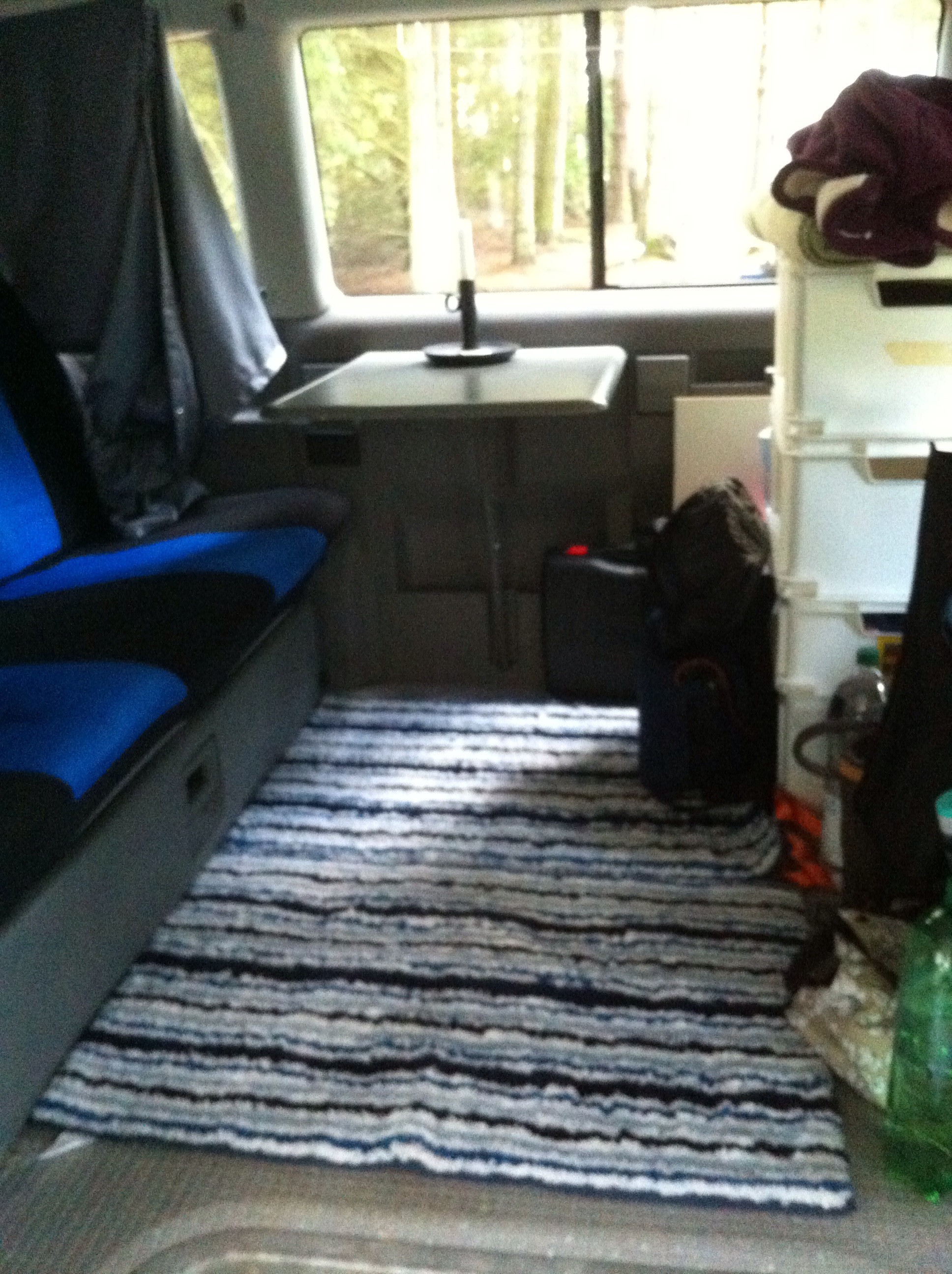 Rain was pouring down heavily and constantly on us today. Even inside the tent and under our umbrella the water dripped down. But we improved Betty’s floor with a carpet matching her colour.