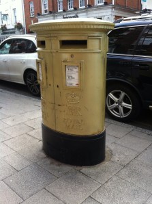 Einen goldenen Briefkasten, wo doch jedes Kind bei uns weiß, dass die Briefkästen in GB rot sind. Die Erklärung dafür: im Zuge der Olympischen Spiele in London wurde im Heimatort jeder britischen Athletin (Männer sind hier eingeschlossen), die eine Goldmedaille gewann, der Postkasten ganz offiziell in Gold umlackiert. Super Idee, oder?