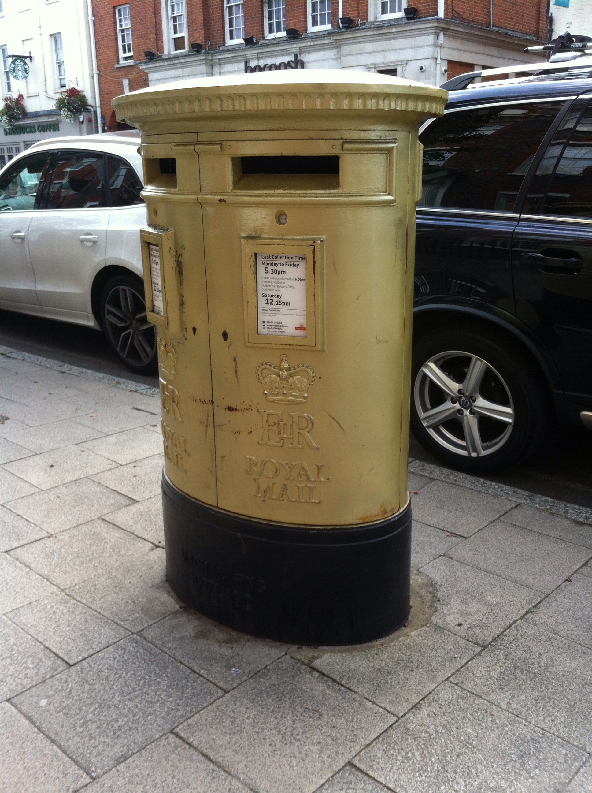 Einen goldenen Briefkasten, wo doch jedes Kind bei uns weiß, dass die Briefkästen in GB rot sind. Die Erklärung dafür: im Zuge der Olympischen Spiele in London wurde im Heimatort jeder britischen Athletin (Männer sind hier eingeschlossen), die eine Goldmedaille gewann, der Postkasten ganz offiziell in Gold umlackiert. Super Idee, oder?