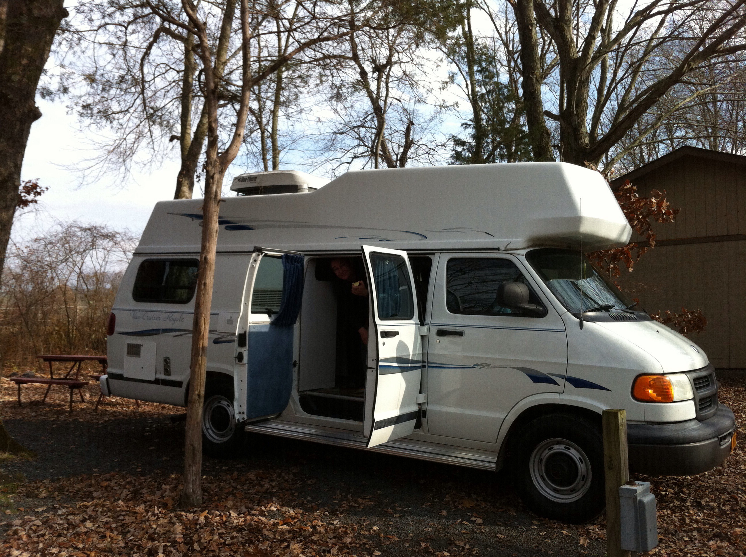 The arrival in Bayonne, NJ was followed by a nine hours odyssey from immigration over a 2,5 miles long walk (no taxis available) to a train station through to 4 hours of public tansport until we arrived far too late at the rental station in Peekskill, NY. But our van camper was waiting for us, fully equipped. We spent two nights on the premises, getting familiar with the car and it’s features, some things had to be fixed as well, getting used to the right side of driving again and doing some shopping. Now we are staying on the Delaware River on a quiet campground near Pocono Mountain, PA and trying to get used to life on the road again. A long shopping spree at Walmart helped with it. Tomorrow we’re heading south.