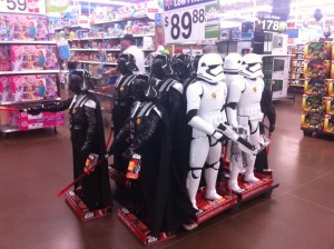 Auf Thanksgiving folgt Black Friday. In der Werbemail von Camping World, dem Partner von Good Sam, bei denen wir eine roadside assistance abgeschlossen haben (der ADAC fühlt sich bei so langen Aufenthalten nicht mehr für uns zuständig), also in der Werbemail stand als Slogan: After the Turkey, you should do some shopping! Viele Menschen nutzen den Freitag nach dem freien Thanksgiving-Donnerstag als Brückentag, so dass sie ein verlängertes Wochenende haben. Seit einigen Jahren wird dieser Freitag zum Einkaufen der meisten Weihnachtsgeschenke genutzt, und die Geschäfte werfen mit satten Rabatten und Sonderangeboten um sich, zum Teil schon während der ganzen Woche. Und damit nicht genug, der Montag darauf heißt dann Cyber Monday, den die Internet-Versender für sich zu nutzen wissen, damit die Menschen noch mehr Geld ausgeben können. Das aber nicht nur hier, die Werbung von  amazon Deutschland und anderen Versendern, bei denen wir manchmal bestellen, erreicht uns per Email-Newsletter auch hier, und auch da ist von Black Friday Angeboten und der Cyber Monday-Woche zu lesen. Für uns fällt dieses Jahr das Einkaufen von Geschenken aus. Zuhause sagen jetzt bestimmt etliche:“Och!!“. Wir werden weiterhin schöne Fotos für euch machen und die dann verschicken. Das erste von lebensgroßen Star Wars Figuren, gesehen bei Walmart, ging personalisiert schon auf die Reise.