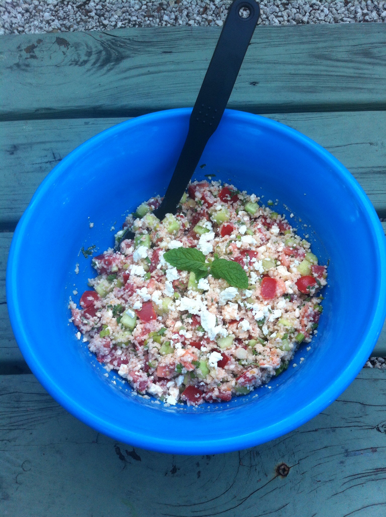 Auf einigen pitches liegt das gute Stück auch in Alufolie eingewickelt auf dem Kugelgrill. Unser Beitrag für das Fest ist europäisch, wir haben einen Tomaten-Couscous-Salat gemacht.