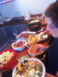 Der Beginn war auf vier Uhr nachmittags terminiert und als gute Deutsche haben wir uns gefragt, wann man dann wohl auftaucht. Aber wir konnten nicht aus unserer Haut und waren pünktlich um zwei Minuten nach vier da. Es standen nicht viele Menschen vor dem River Room, in dem das Buffet aufgebaut werden sollte. Okay, dann waren wir wohl zu früh. Aber nein, als wir hinein gingen, um unseren Salat abzugeben, bog sich das Buffet schon unter der Last verschiedenster dishes, unglaublich!