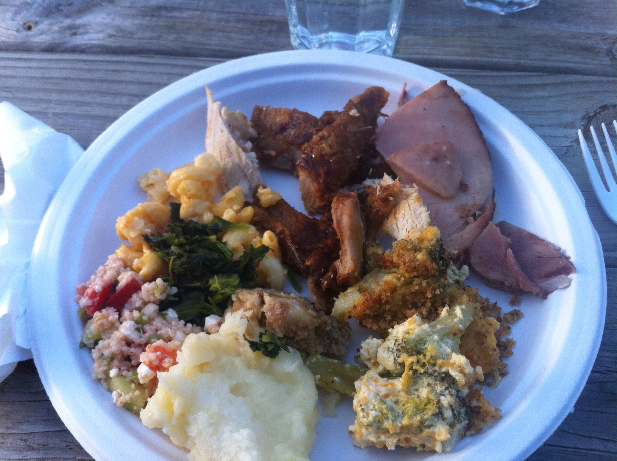 Noch ein bisschen länger gewartet, bis das Buffet eröffnet wurde und dann rein in die Warteschlange, wir lagen weit vorn, und den ersten Teller gefüllt. Der ham, süßlich schmeckender gekochter Schinken und der turkey, in zwei Varianten, deep-fried in Erdnussöl und im Ofen gegart für die Erdnussallergiker, waren bereits aufgeschnitten.