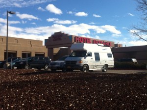 So, unser Weihnachtsgeschenk haben wir seit gestern „ausgepackt“: angesichts der frostigen Temperaturen hier, in Pueblo of Pojoaque bei Santa Fe, NM, haben wir ein Hotelzimmer bezogen. Die Sonne scheint trotz leichter Bewölkung, der Himmel hier oben ist quietschblau, die Luft klar. Wir sind auf fast 1800 Meter über NN, umgeben von schneebedeckten Bergen. El Niño scheint in diesem Jahr recht kaltes Wetter nach Kalifornien, Arizona, Nevada und New Mexico zu bringen. Von daher sind wir uns nicht mehr so sicher in unseren Reiseplänen ab Januar. Wir werden sehen und erst einmal das warme Hotelzimmer genießen, das mehr als doppelt so groß ist, wie unser Van. Endlich wieder ausstrecken können beim Schlafen und auch das Kopfstoßen hat vorerst ein Ende.