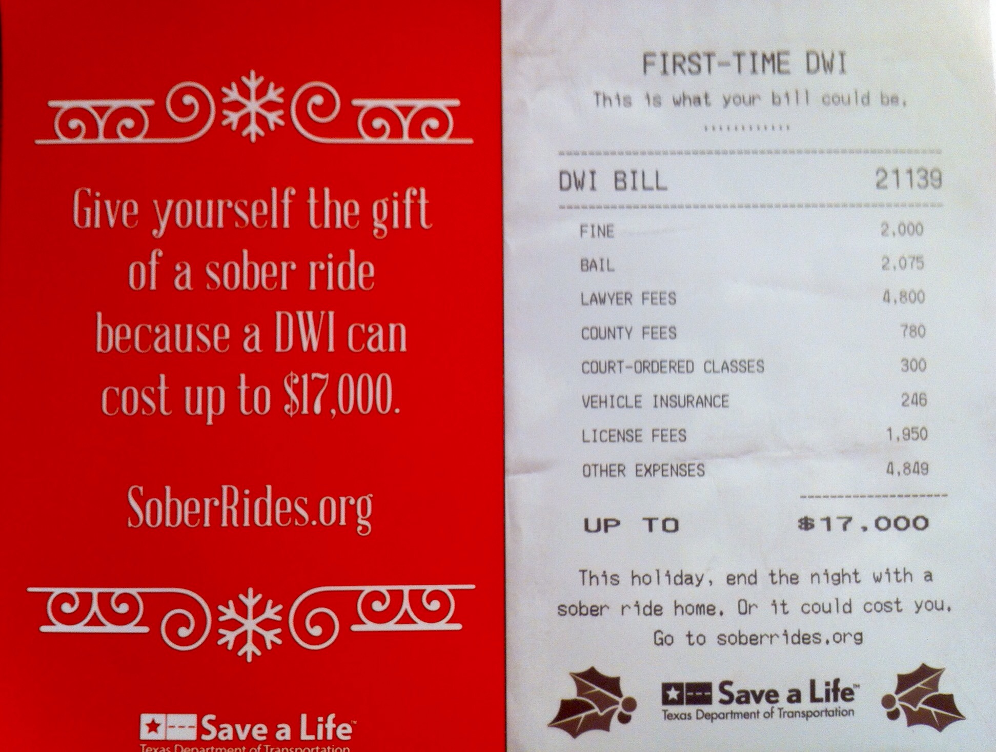 DWI bedeutet drive while intoxicated. Wenn man das erste Mal betrunken erwischt wird, sind schon gern mal bis zu $ 17.000 fällig. Von daher, immer schön nüchtern bleiben, auch über die Feiertage.