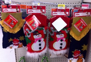 Natürlich haben wir auch an die lieben Begleiter gedacht, die viele von euch haben. In Amerika tragen alle Menschen anscheinend gern Weihnachtspullis, ganz nach dem Motto: The uglier the sweater the merrier the season! (Das haben wir tatsächlich im Radio gehört.) Und hier gibt es die auch für Hunde, und sie werden getragen, von Walmart:
