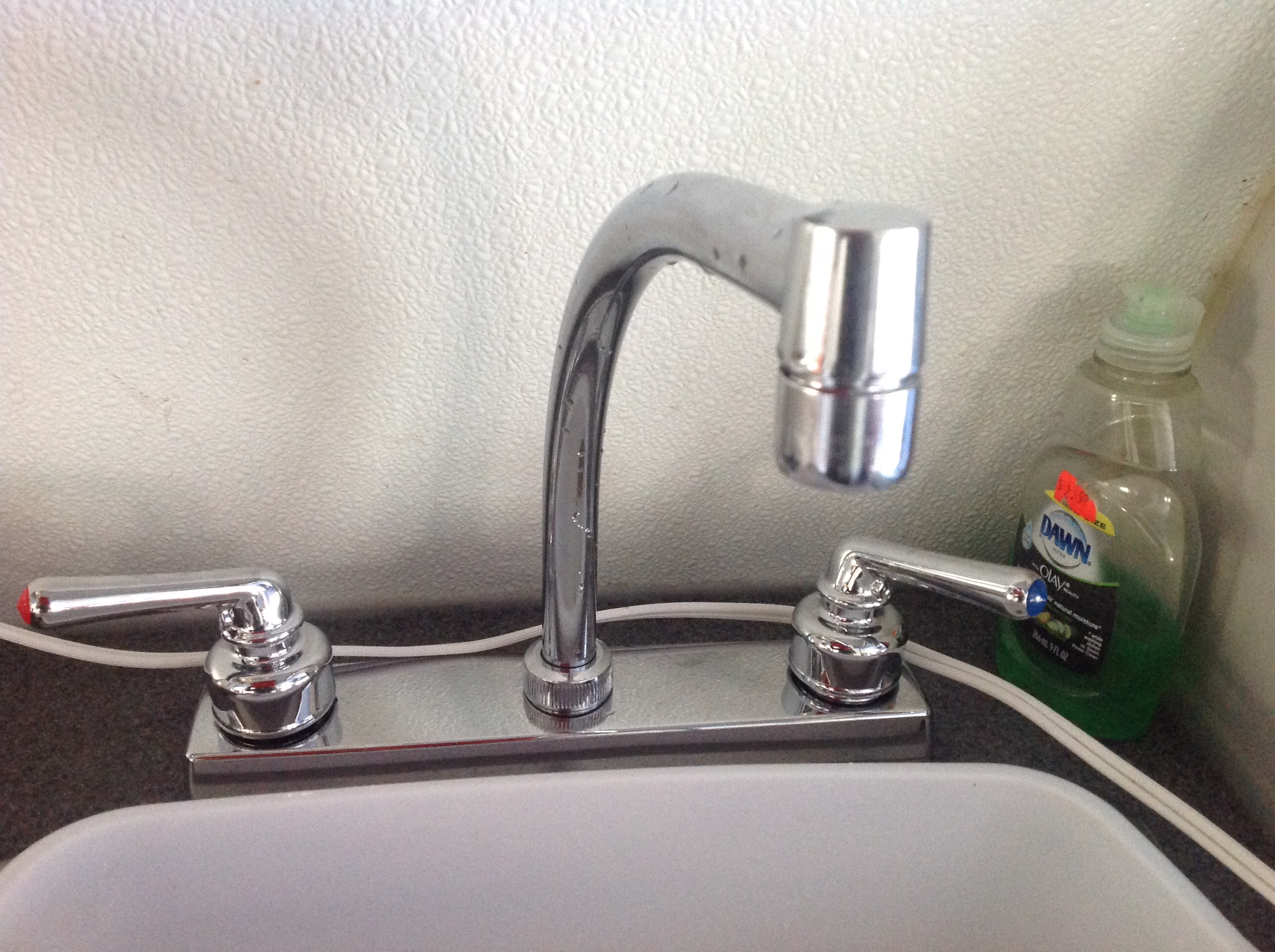 Da wir in unserem Auto leben und kein Haus als Alternativunterkunft haben, war dieses Vorgehen von vornherein nicht möglich. Also haben wir die Armatur auf dem Weg hierher eingekauft und innerhalb weniger Minuten mit zwei Schraubverschlüssen montiert.