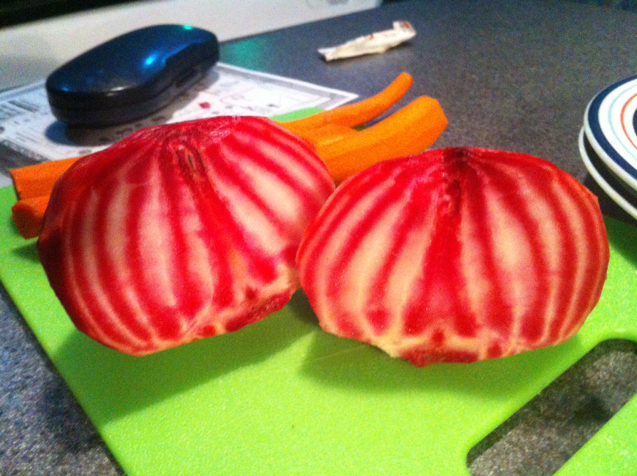 Es muss eine verwandtschaftliche Beziehung zu unseren Roten Beten geben, der Geschmack legte das nahe. Leider verlor die Frucht nach dem Schmoren die hübsche Färbung, blieb aber lecker in der Kombination mit Möhren und roten Kartoffeln.