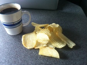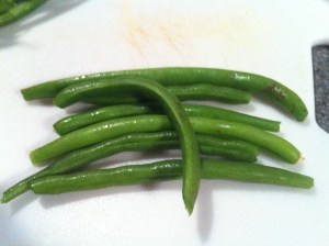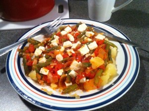 Die Fotostrecke zeigt es: frische grüne Bohnen, davon sollte man nur ca. 7 Stück essen; dazu eine mediumgroße Kartoffel (unsere waren sehr klein, darum sind zwei auf dem Foto); eine Portion Kartoffelchips (die gehören hier oft genug zum Essen dazu) besteht dann aus ca. 15 Stück. So bleibt natürlich extrem viel Platz für Fleisch auf dem Teller. Da wir das hier im Campervan nicht zubereiten, haben wir das Gericht vegetarisch modifiziert: mehr Bohnen und Kartoffeln, eine Dose gehackte Tomaten dazu plus etwas schärfer gewürzt, anschließend mit Fetakäse bestreut.