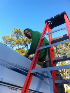 der durchaus qualifizierte mobile Servicemann ganz allein auf der hohen Leiter