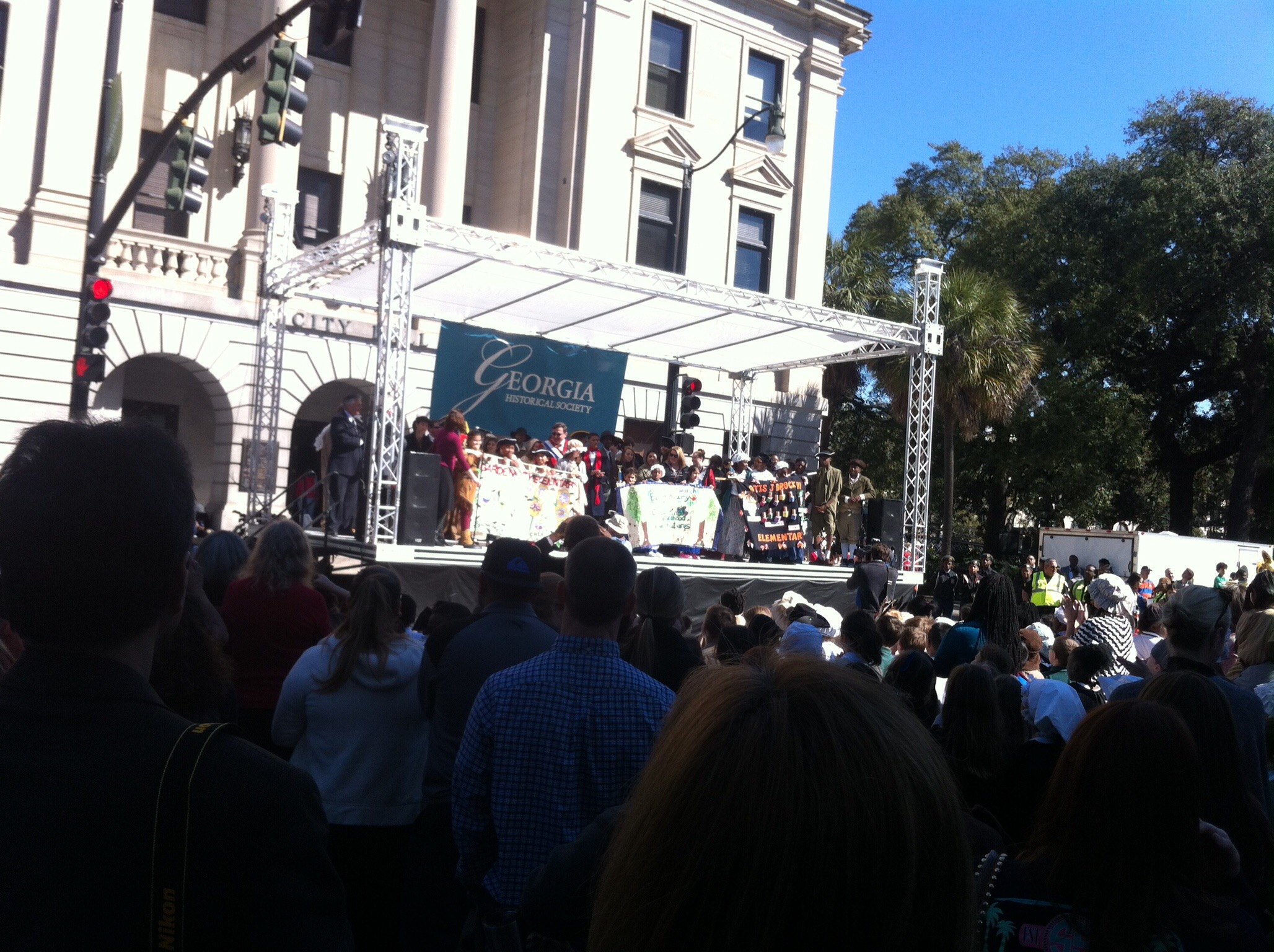 Am Ende der Route wurden die Kinder von Offiziellen begrüßt, u.a. von der veranstaltenden Geschichtsgesellschaft, vom Bürgermeister, von Schulbehörde und Schulaufsicht, und ihre Teilnahme wertgeschätzt. Die Jugendlichen, die die historischen Persönlichkeiten darstellten, durften auch mit auf die Bühne. Georgias bester Lehrer, der in diesem Jahr aus Savannah kommt, wurde ebenfalls vorgestellt. Nach Treueschwur auf Flagge und Staat und Singen der Nationalhymne wurden die besten drei Schulbanner prämiert, denn man konnte sie vorher zu einem Wettbewerb einreichen.