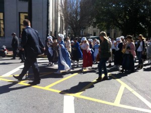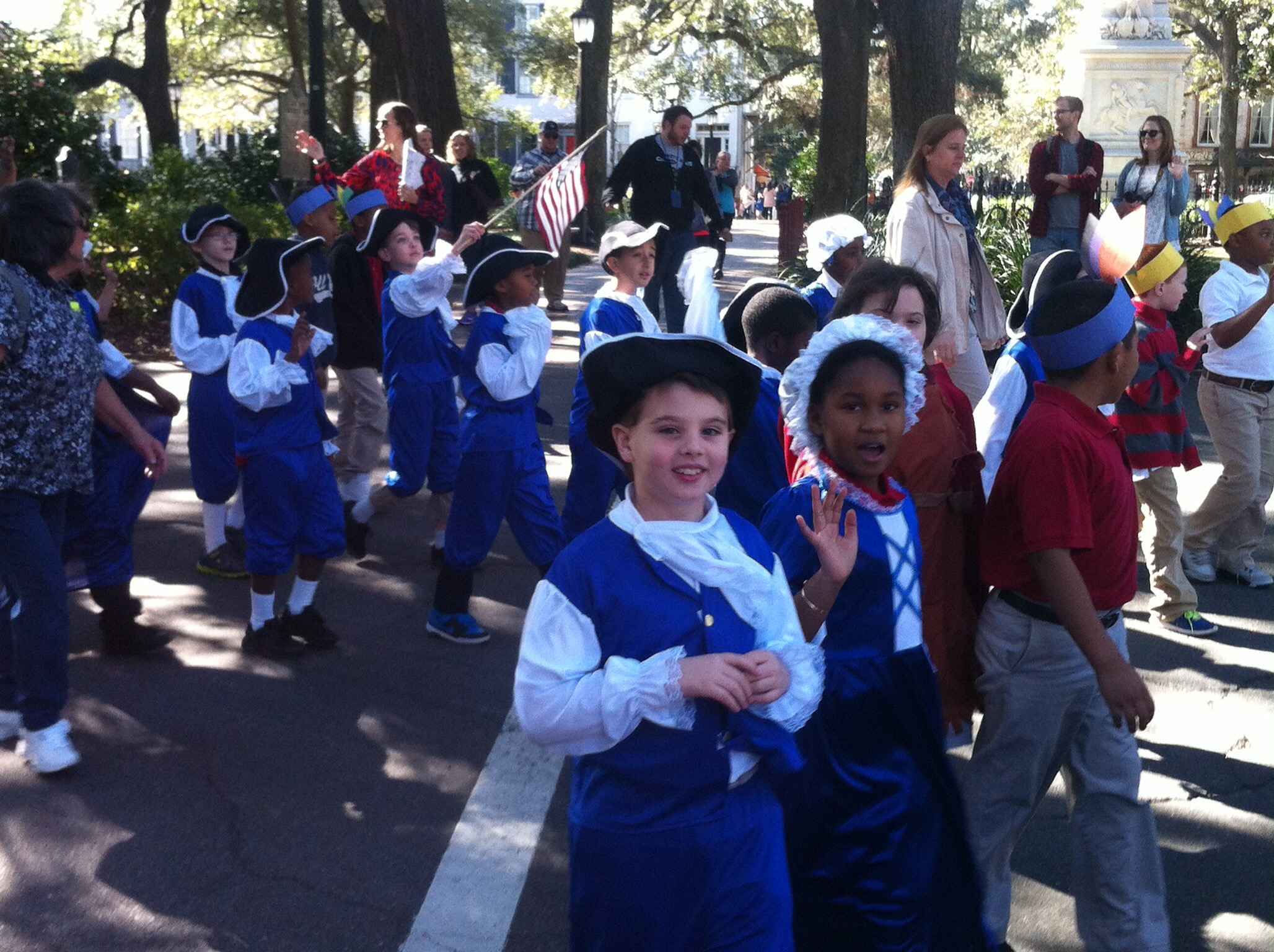 Dann folgten einige Jugendliche und Erwachsene in Kostümen, die den Gründungsvater Oglethorpe und weitere wichtige Personen aus der Vergangenheit darstellten, z.B. Juliette Gordon Low, die 1912 die Girl Scouts gegründet hat. Anschließend kamen kleinere Schulkinder, überwiegend Zweitklässler, da diese sich laut Lehrplan in dem Schuljahr besonders mit Georgias Geschichte beschäftigen.