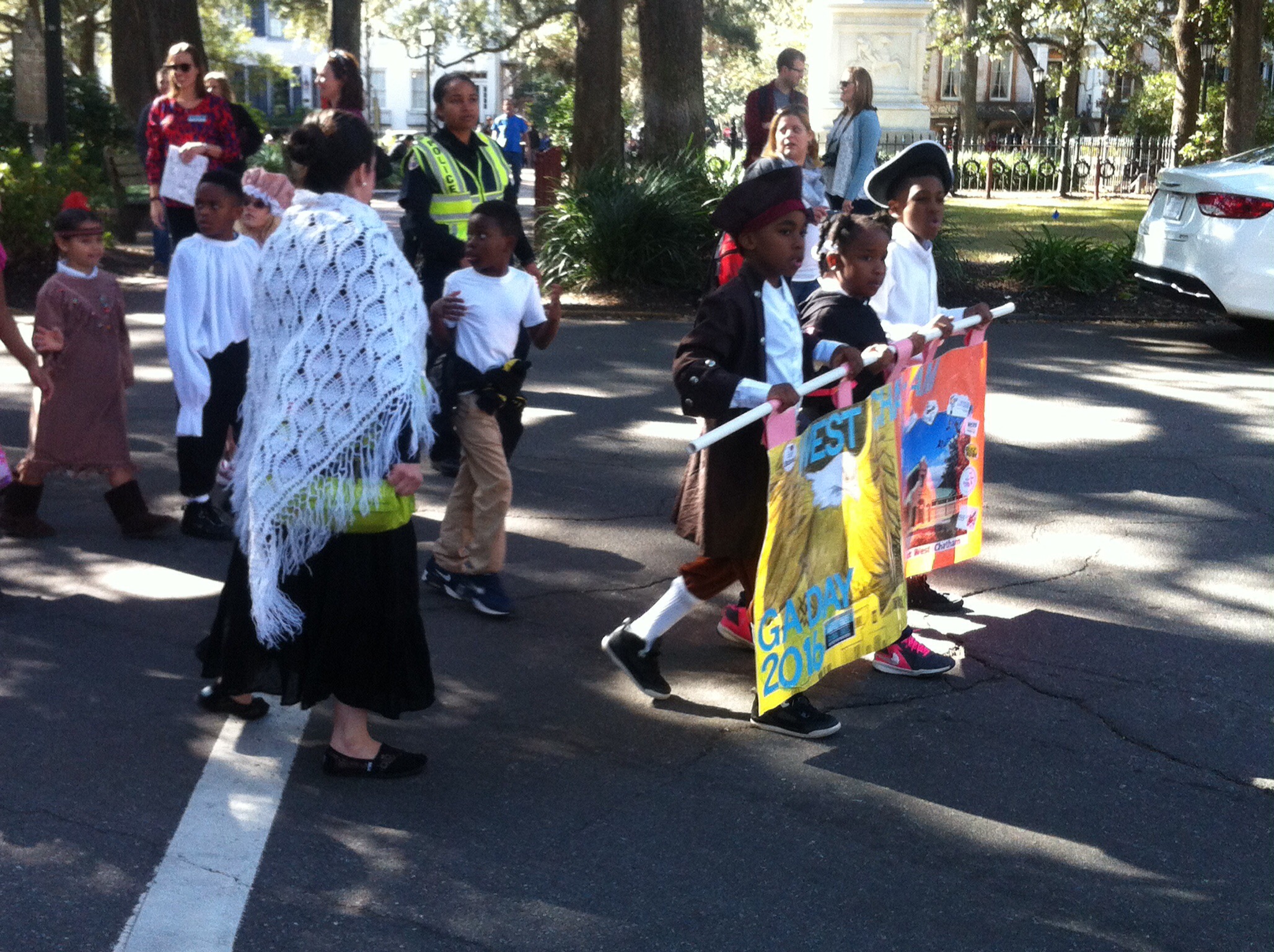 Jede teilnehmende Schule aus dem County trug ein Banner ihrer Schule voran, dann kamen die kostümierten Kinder, lauter kleine Siedler und Indianer, natürlich auch jeweils die weiblichen Formen davon. Auch die meisten der erwachsenen Begleitpersonen und Lehrkräfte waren kostümiert. „Happy Georgia Day“-Rufe und winkende Kinder, die das grazile Winken aus dem Handgelenk vorher mehr oder weniger erfolgreich im Unterricht geübt hatten, insgesamt nahmen 3500 Kinder an dem Umzug teil.