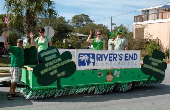 After ten really relaxing weeks on Tybee Island we have to say Goodbye. We’re heading to Asheville in North Carolina tomorrow, from the beach into the mountains. This island became a home for us and it’s hard to leave. But it’s getting more and more crowded, more and more humid and parts of the great staff who became friends will leave soon. So it’s time for a change. But just our mood is blue today, everything else is green. Literally everybody is wearing something green today, the shuttle buses carry loads of people to the big St. Patrick’s Day Parade in downtown Savannah and there is at least one leprechaun on every bus. Even the ticket salesman, an Afroamerican, wears a green T-shirt, but this one states „0% Irish“.