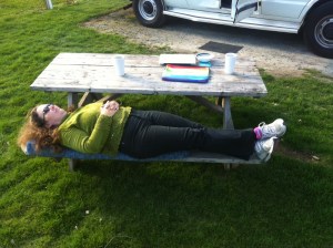 Heute morgen haben wir eine Familie aus Hamburg getroffen, die sich morgen nach zwei Wochen in einem gemieteten RV wieder auf den Rückweg nach Deutschland macht. Da wir noch etwas länger bleiben, haben wir gern deren restliche Lebensmittel übernommen. Das war ganz praktisch, da uns sowieso gerade das Wasser ausgegangen war. Vorgestern bekamen wir schon frische Biokartoffeln von Carrie, eine der hosts, geschenkt. Die Kartoffeln sind jede Woche in deren farm bag, die lokale Entsprechung zu unseren Bio-Gemüsekisten. Aber sie essen Kartoffeln gar nicht gern. So hatten wir Glück und kamen zu einer leckeren Mahlzeit.