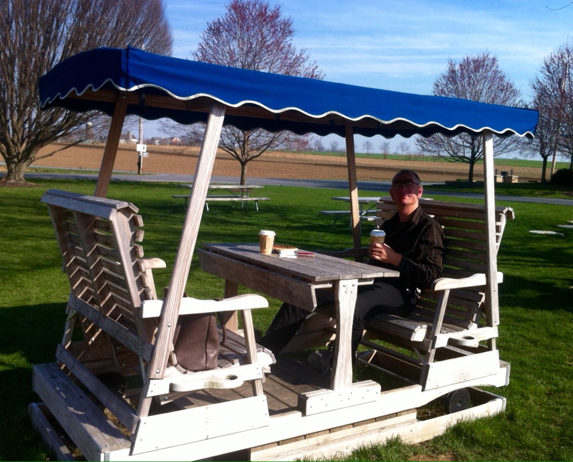 Danach brauchten wir dringend einen Kaffee und guten Kuchen. Dafür sind wir zurück auf’s Land gefahren, nach Bird-in-Hand, der Ort heißt wirklich so. Dort gibt es seit 42 Jahren eine familiengeführte Bäckerei, die sehr leckere lokale Spezialitäten herstellt. Wir saßen dann auf einer Picknickkombination, die sich auf Rollen hin und her bewegen ließ, so ähnlich wie eine Wippe, aber eben nicht auf und ab, sondern nur hin und her, und genossen unseren Kaffee, den Pecan Pie und die Sonne.