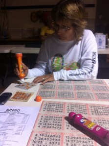 Freitags ist also Bingo Night bei der American Legion. Martina ist mit einer Bekannten vom Campingplatz hingegangen und kennt die deutsche und die dänische Spielweise beim Bingo mit Pappkärtchen, auf denen die Zahlen sind, und Plättchen, manchmal magnetisch, manchmal nicht, mit denen man die aufgerufenen Zahlen abdeckt. Hier kauft man ein Set mit acht farbig unterschiedlichen Blättern, auf denen 9 oder 12 Bingofelder zu sehen sind (die Menge der Felder hängt vom Einsatz ab). Dazu kann man dann noch jede Menge extra Bingofelder und Lose kaufen. Mit einem dabber, eine Art überdimensionaler Filzstift, den man praktischerweise auch vor Ort erwerben kann, wenn man keinen hat, werden die aufgerufenen Zahlen mit einem großen Punkt versehen. Wenn eine Spielrunde zuende ist, wird das Spielblatt abgerissen, zerknüllt und weggeworfen; wieder eine Chance der Nachhaltigkeit verpasst. (Unsere Spielweise zuhause mit den immer wieder verwendbaren Pappkarten war hier auch mal bekannt: so wurde es früher, auf die altmodische Weise, gespielt.) Keine Frage, die dabber sind alle quietschbunt, einige Spielerinnen brachten auch welche mit Glitzer mit. Martina hat sich vor Ort für einen fuchsia-farbenen dabber entschieden. Man ruft „Bingo“, wenn man das vorher angekündigte Ziel erreicht hat, das ist so wie zuhause. Aber ein normales Bingo erreicht man hier nicht nur mit fünf Zahlen (vier in Wirklichkeit, da das mittlere Feld eines 5×5-Feldes immer ein Joker ist) in einer horizontalen, vertikalen oder diagonalen Reihe, sondern auch, wenn die vier Ecken gedabbt sind. Dann gibt es Runden, in denen man zwei Reihen benötigt oder die ganze Karte gefüllt sein muss.