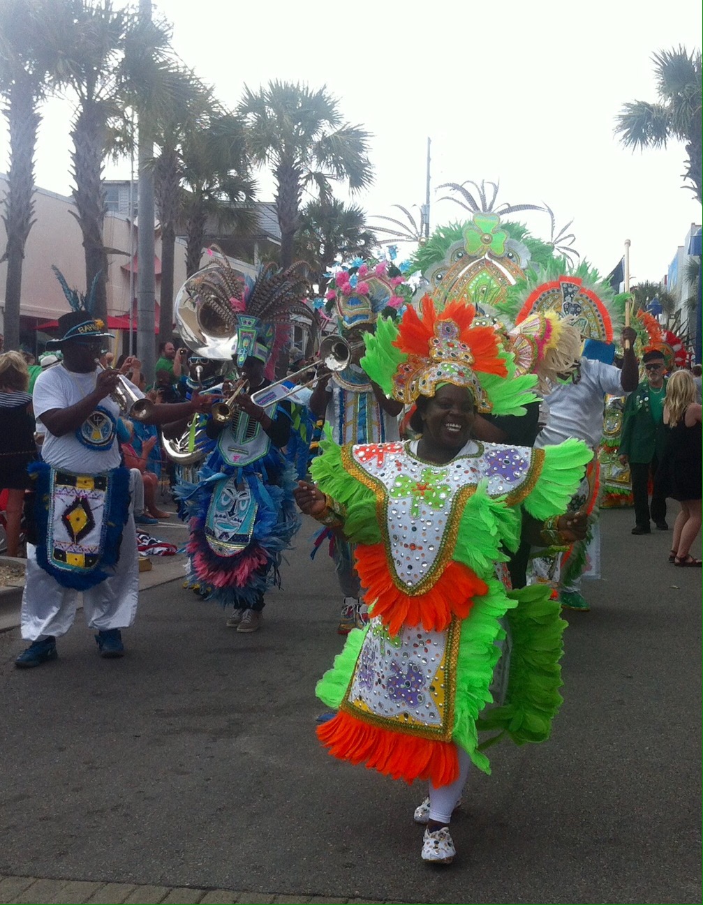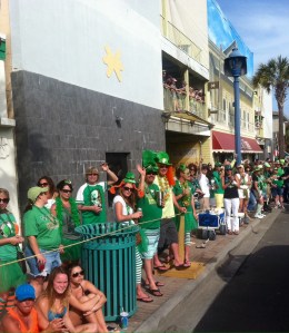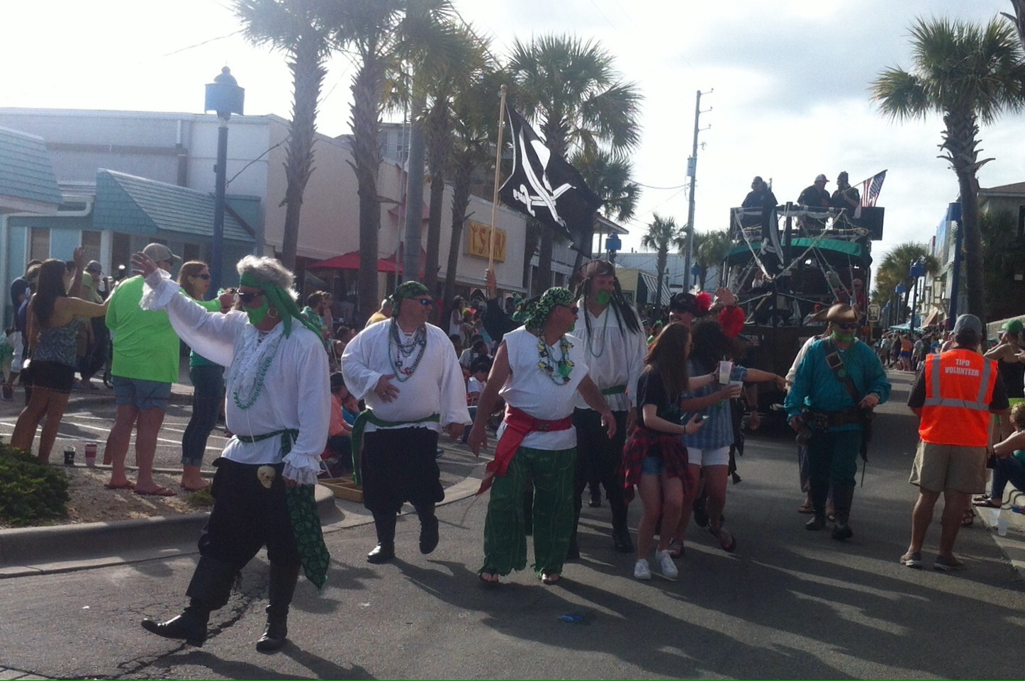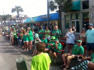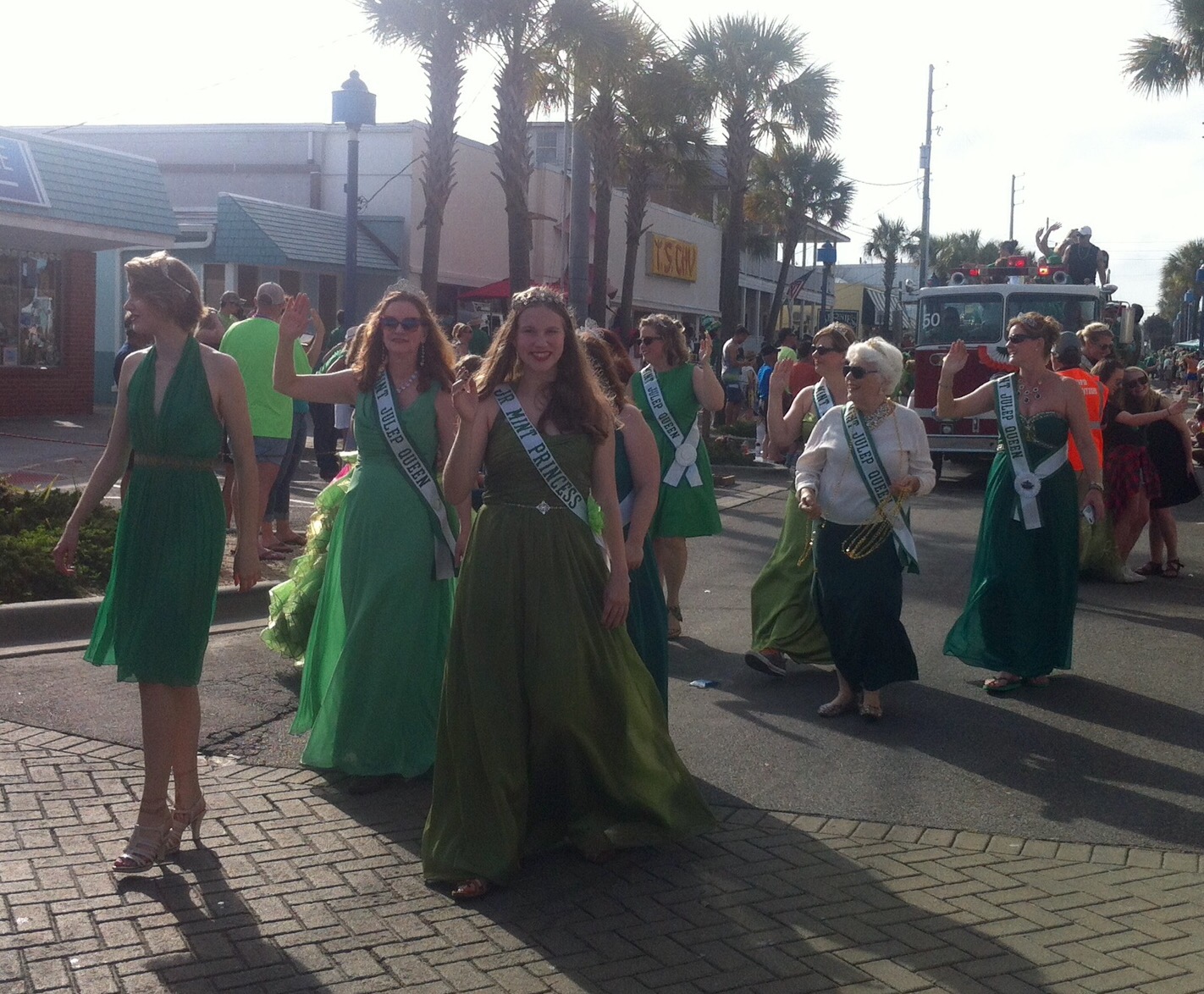 The Crab Shack float an Irish Samba marching band, good music!Irish mermaid a typical Irish fluffy animalthe dog must be an Irish breed Irish sheiks or even eunuchs, who knowsIrish pirates Irish coke, of coursean irish-scottish invader from the sea the entourage of the 2014 Beach Bum Queengiant Irish peanut the colour green rules the world: mint julep queens and princessesand even more Irish pirates Yesterday’s Irish Heritage Parade was much bigger than the last parade we’ve seen on the island. Everything was green and everybody was Irish, at least for one day and the parade. People need a reason to get drunk already in the afternoon. We were lucky because we actually participate in the parade. We drove on the campground ’s float, waved our arms off and shouted ‚Happy St. Patrick’s Day‘. And we took pictures of all the amazing green people. For Northern Europeans and Americans from the Northern states this is pure summer feeling right now. Day temperatures around 79 degrees and 64 degrees at night. People on the beach are dressed accordingly, bikinis and Bermuda shorts everywhere, even if their physical appearance sometimes would suggest a more appropriate apparel.