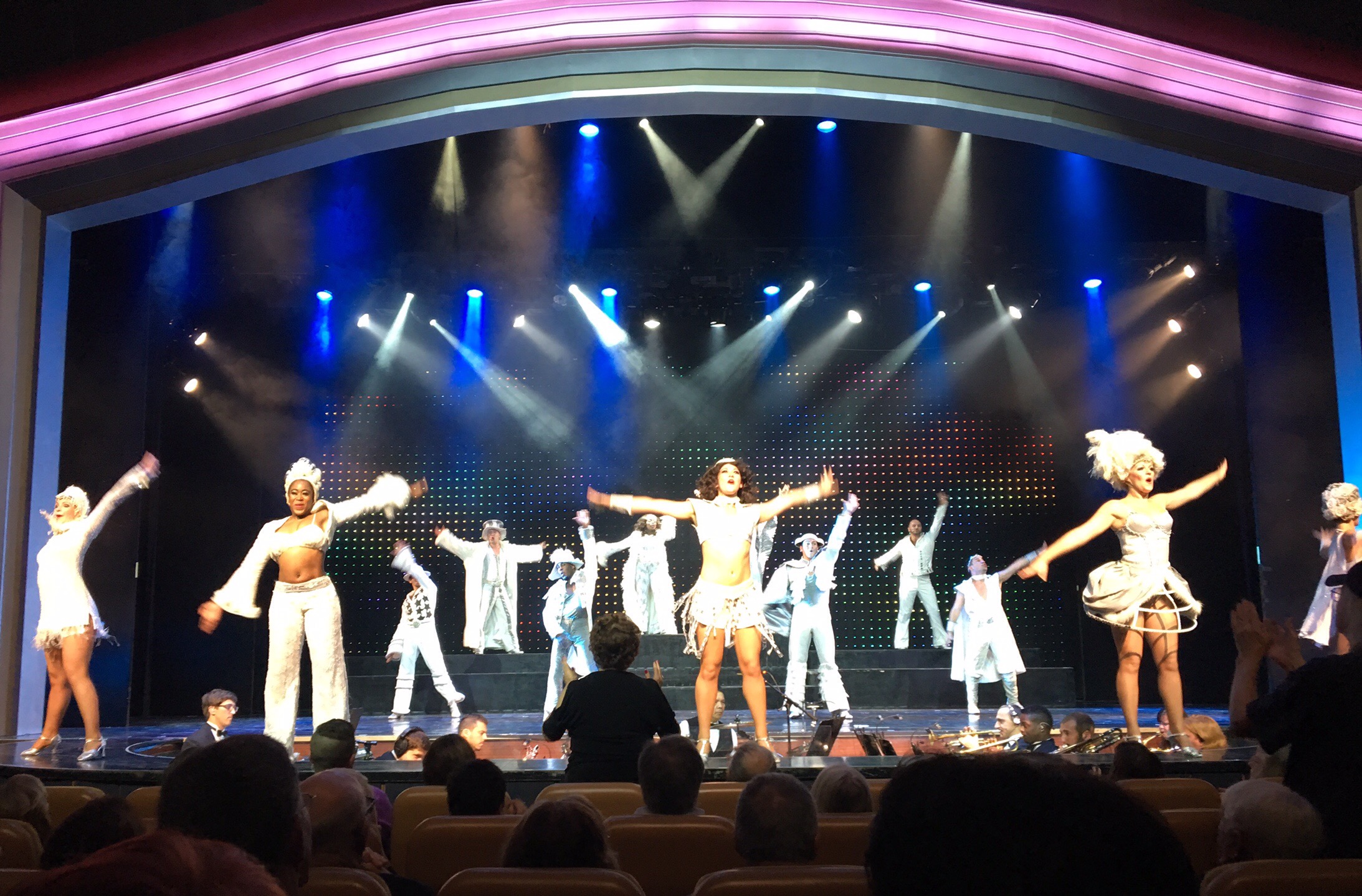 Wenn wir abends nicht zu müde sind, gucken wir uns die unterschiedlichen Shows an. Außer den musikalischen Shows mit Sängern und Tänzern zu Broadwaymelodien haben wir eine ganz tolle Zaubershow gesehen, eine Show mit Motownhits, eine Show mit einer Beatles Tribute Band, sehr stilecht aus Liverpool eingeflogen und eine Eistanzrevue, atemberaubend auf relativ kleiner Fläche. Das Schiffsorchester ist prima, manchmal spielte ein Teil von ihnen als Jazzband. Es gibt mehrere Band, die in den unterschiedlichsten Bars spielen. Sie spielen nachmittags auch im Poolbereich, den wir zum Baden vermieden haben, obwohl er schön gestaltet ist. Aber es ist dort immer voll und laut.