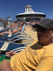 Es ist sehr schön warm hier in der Karibik bei konstantem Sonnenschein und unglaublich blauem Wasser. Jetzt im Frühjahr ist es für uns eine gute Zeit, sich hier aufzuhalten, wir haben die 30-Grad-Marke noch nicht ganz erreicht. Und es ist windig oben auf den Sonnendecks. Die kreuzfahrterprobten haben große Klammern mitgebracht, mit denen sie die Handtücher an den Liegen befestigen. Wenn man vorne um den Bug geht, weht der warme Wind so stark, dass der Kaffee aus dem Becher auf das T-Shirt weht (und der Becher war nicht bis zum Rand gefüllt).