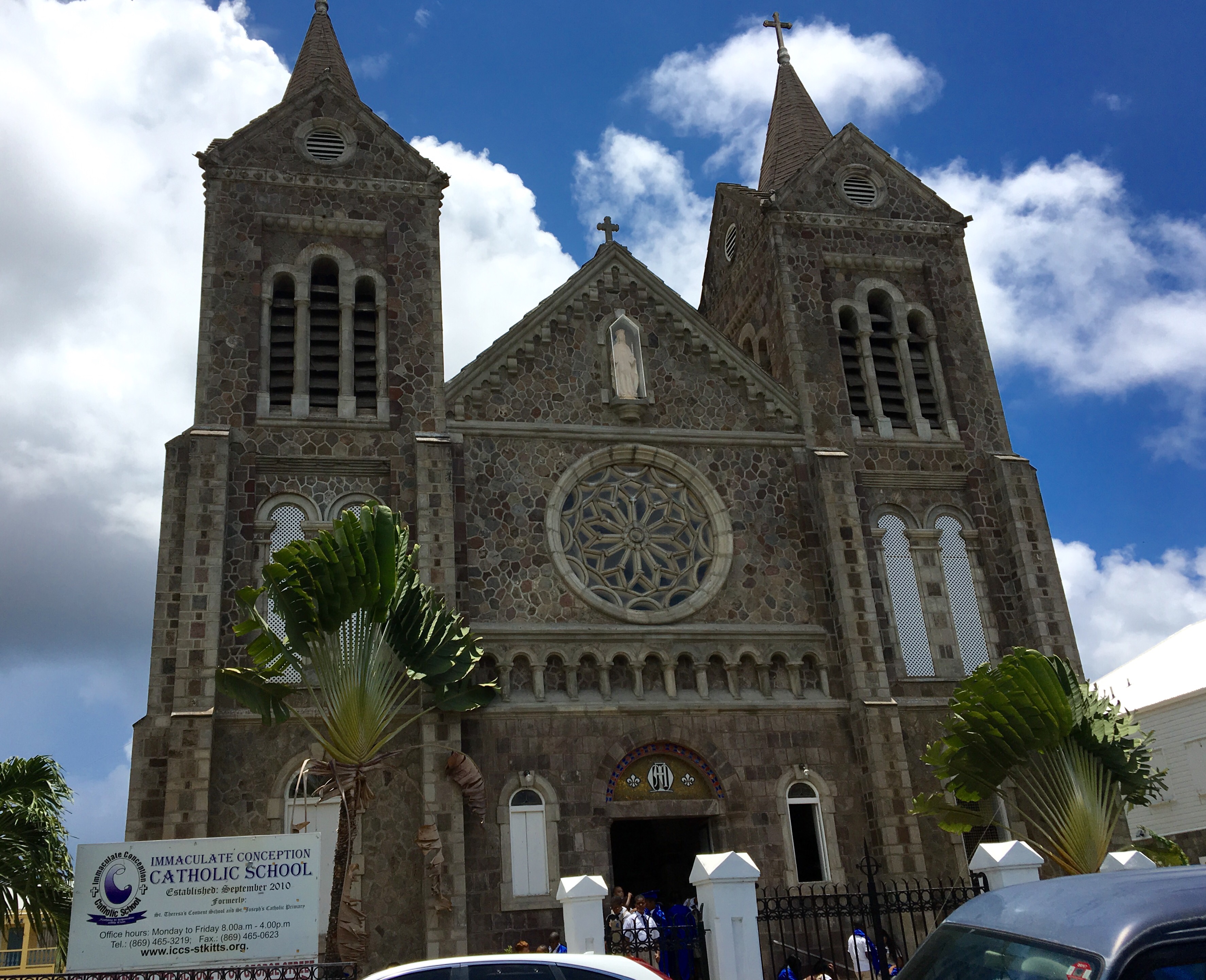 Auch hier machten wir wieder direkt an der Altstadt der Inselhauptstadt Basseterre fest. Aber diese Insel war eher enttäuschend. Direkt am Hafen gibt es eine große Shopping Mall, da man hier duty free einkaufen kann. Die Altstadt dahinter ist sehr ärmlich und heruntergekommen. Wir haben eine Tour auf eigene Faust gemacht und außer uns waren von den viertausend Menschen auf dem Schiff noch fünf andere unterwegs. Hier waren nur Kittians, so nennen sich die Einwohner, zu sehen, die ihren alltäglichen Geschäften nachgingen. Aber von den Touristen scheint hier wenig Geld anzukommen. Das Geld wird wohl eher am Strand gemacht. Da wollten wir eigentlich auch noch hin, da der hier sehr schön sein soll. Dorthin kommt man aber nur mit einem Taxi. Dazu hatten wir aber nach zweieinhalb Stunden in der prallen Sonne bei 30 Grad keine Lust mehr, vor allem, weil am Strand auch kein Schatten zu erwarten war. Deshalb ging es frühzeitig wieder aufs Schiff, um die Kühle, den Schatten, den Wind und das Essen zu genießen. Vom Schiff aus war auch gut zu sehen, dass die Insel aus einer langen Hügelkette besteht. Früher gab es hier viele Zuckerrohrplantagen, die enorm viel Geld abgeworfen haben. Aber von dem Glanz ist nichts mehr zu sehen, jedenfalls nicht in dem Teil der Hauptstadt, in dem wir waren. Die kleinere Nachbarinsel Nevis hat ihren Namen wahrscheinlich vom Mt. Nevis in Schottland. Der Berg in der Mitte sieht ähnlich aus und war wie sein Namensvetter den ganzen Tag wolkenverhangen. Diese beiden Inseln bilden einen souveränen Staat und sind Mitglied des Commenwealth. Die Autos fahren links und auf den Münzen (ja, auch hier haben wir eine gefunden) ist die Queen abgebildet. Die Schulkinder tragen Uniformen und die größte Kirche ist eine anglikanische Kathedrale (auch sehr renovierungsbedürftig).