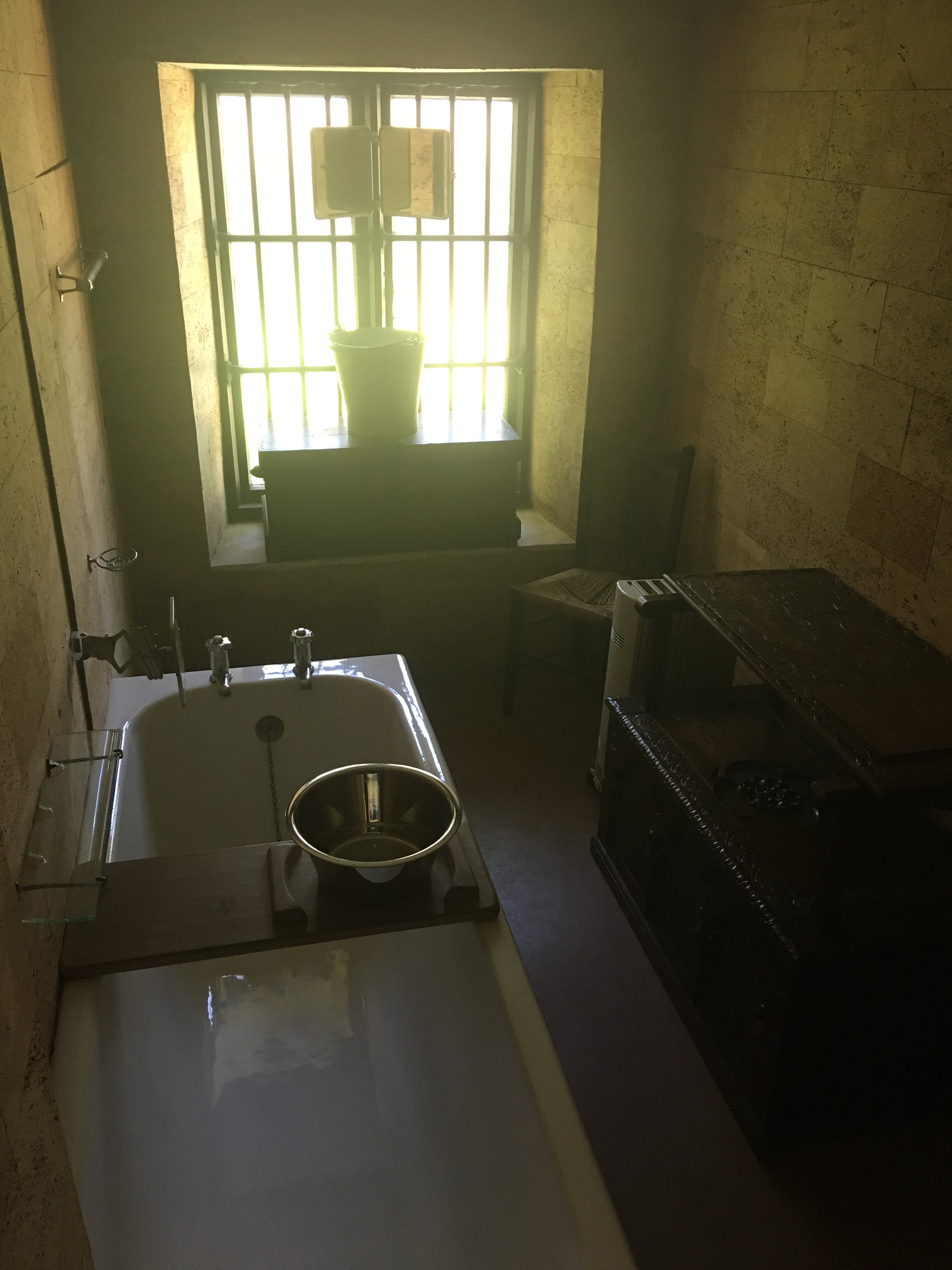 Auch im Haus selbst waren wir wieder drin. Zum einen wollten wir uns die Zimmer im oberen Stockwerk ansehen, die uns bei den beiden letzten Besuchen verschlossen blieben. Der Maid’s Room war interessant, Downton Abbey läßt grüßen. Aber spannender war der Blick durch’s Schlüsselloch des Badezimmers. Dort fiel der Blick auf ein ausgewachsenes Krokodil in der Badewanne (Malwine lässt grüßen). Es war aus Pappmaché und die Geschichte dazu war folgende: die Söhne von Maud Russell, der letzten Besitzerin von Mottisfont, bekamen von Freunden der Eltern ein kleines Krokodil geschenkt, das fortan in der Badewanne im ersten Stock wohnte, bis es zu groß war. Dann gaben sie es in einen Zoo. Wir hätten uns in dem Fall schon überlegt, ob Menschen mit so einem Geschenk weiterhin unsere Freunde wären. Aber die Frau, die uns die Geschichte erzählte, meinte dazu lapidar: „Those were the times.“ So war es halt damals in den Kreisen, die Geld hatten und Künstlerfreunde.