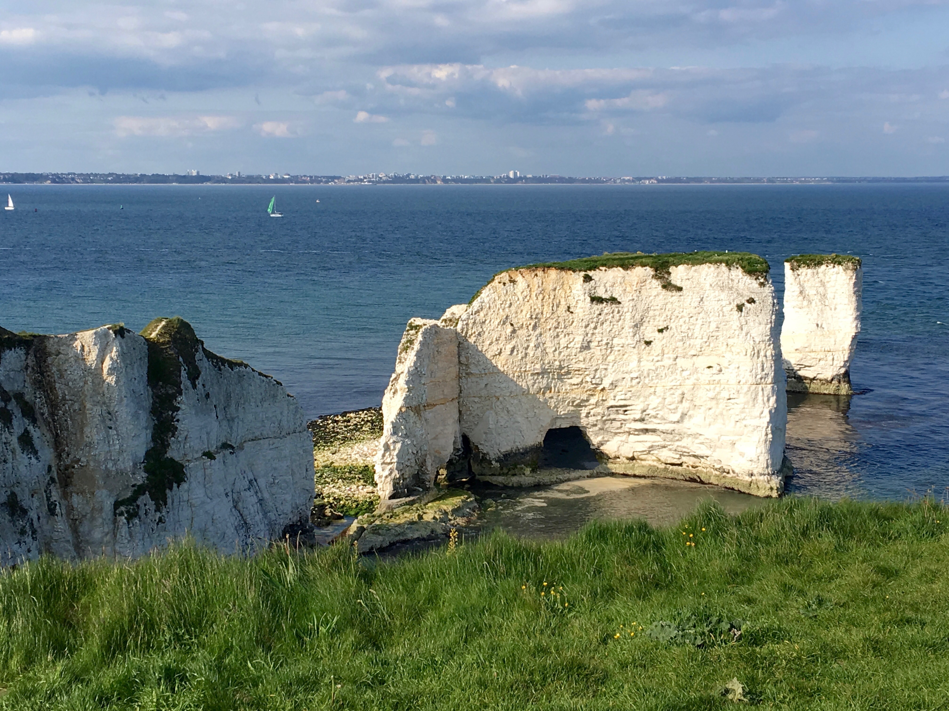 Die eine Seite der Purbeck-Halbinsel liegt am Ärmelkanal und die Fahrt nach Studland Bay war nicht weit. Dem NationalTrust gehört dort der Küstenstreifen, an dem man baden (das war uns zu kalt), sich die geologisch sehr interessanten Gesteinsschichten der Steilküste von der Wasserkante aus ansehen (Teil des Weltnaturerbes Jurassic Coast) und auf der Kliffkante zu den Old Harry Rocks spazieren kann. Letztere waren besonders beeindruckend, zwei Kreidefelsnadeln ein Stückchen entfernt von der Küste. Bis zur letztmöglichen Fotooption (man kann den schmalen weißen Pfad links im Bild auf dem kleinen Grad erkennen) trauten wir uns wegen der potentiellen Absturzgefahr aber doch nicht heran. Aber auch so sind schöne Fotos gelungen. Wir konnten sogar die Isle of Wright sehen.