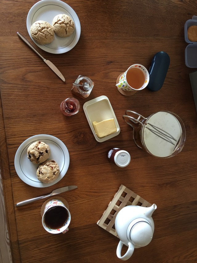 Und wir vermissen tea and scones. Aber das kann man ja auch selbst machen. Daher haben wir eine kleine Testreihe gestartet. Inzwischen sind wir bei einem Rezept aus einer National Trust Broschüre gelandet und modifizieren es nach und nach für unseren Geschmack. Sie sind zwar noch nicht ganz optimal, aber es sieht doch schon ganz gut aus, oder?