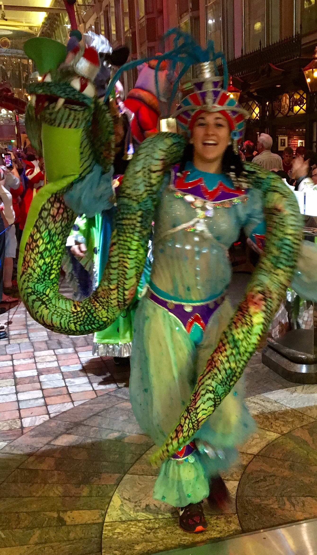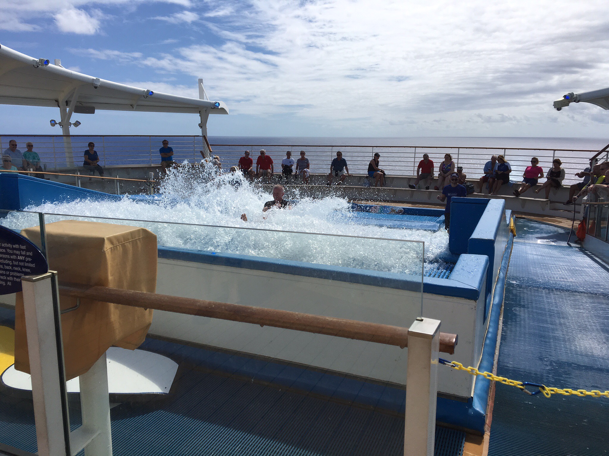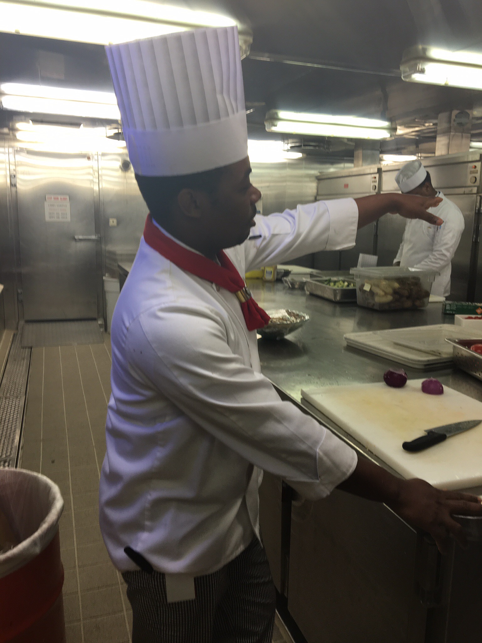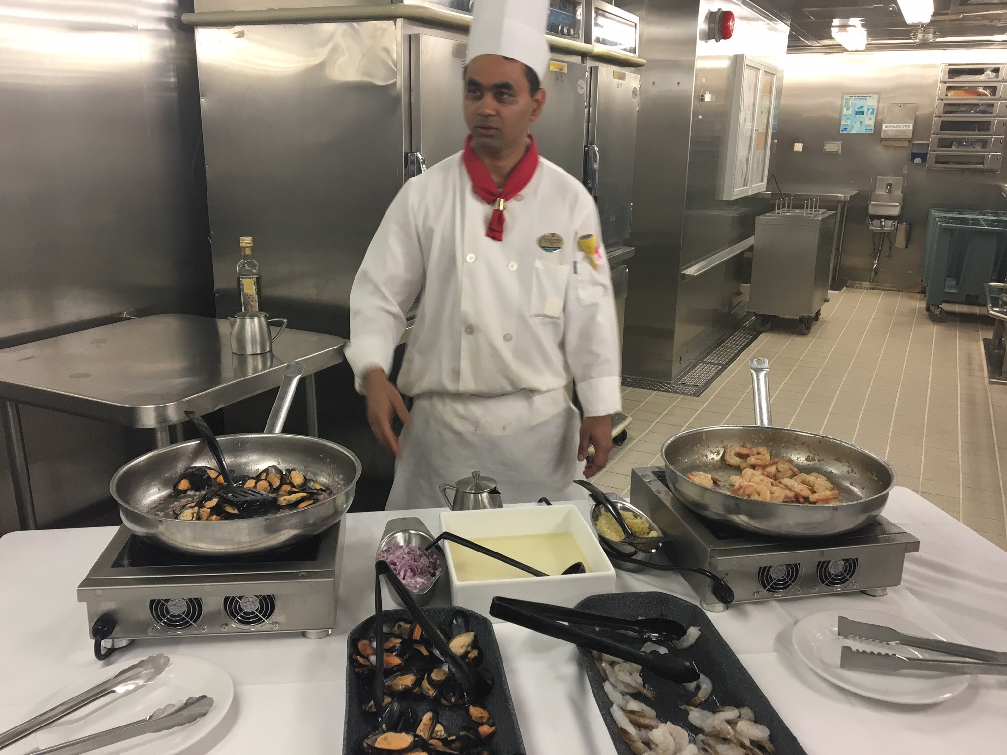 unsere Kabine 6202, nach vorne raus, schaukelte doch ordentlichflow riderdie sportlichen Aktivitäten wie rock climbing, flow rider, ice skating oder auch Minigolf spielen, haben wir diesmal ausgelassenBingo spielen wird jeden Tag angeboten, aber noch viel mehr Menschen sind jeden Tag im CasinoCircus Show auf der PromenadeCircus Showwilde Tiere waren auch dabeinoch eine Show, diesmal mit Solomon Jaye, super! und natürlich dem fantastische Orchestereine der vielen Kunstauktionen an Bord, auf denen Amerikaner kitschige Bilder kaufenwir haben eine Galleytour gebucht und bekamen einen Einblick in die Abläufe der Küchen.alle unsere Fragen wurden beantwortet, z.B. die nach den immer gerade richtig reifen Bananen. die werden in unterschiedlichen Reifegraden gebunkert und können so während der Fahrt nachreifen.anschließend ging es zum Brunch, um die vielen schön zubereiteten Dinge zu probieren; die Muscheln und Shrimps wurden für jeden frisch zubereiteteines der vielen unterschiedlichen Currys, die jeden Abend serviert wurdenLobster Night, und wenn man nett ist, bekommt man auch mal drei Hummerschwänze