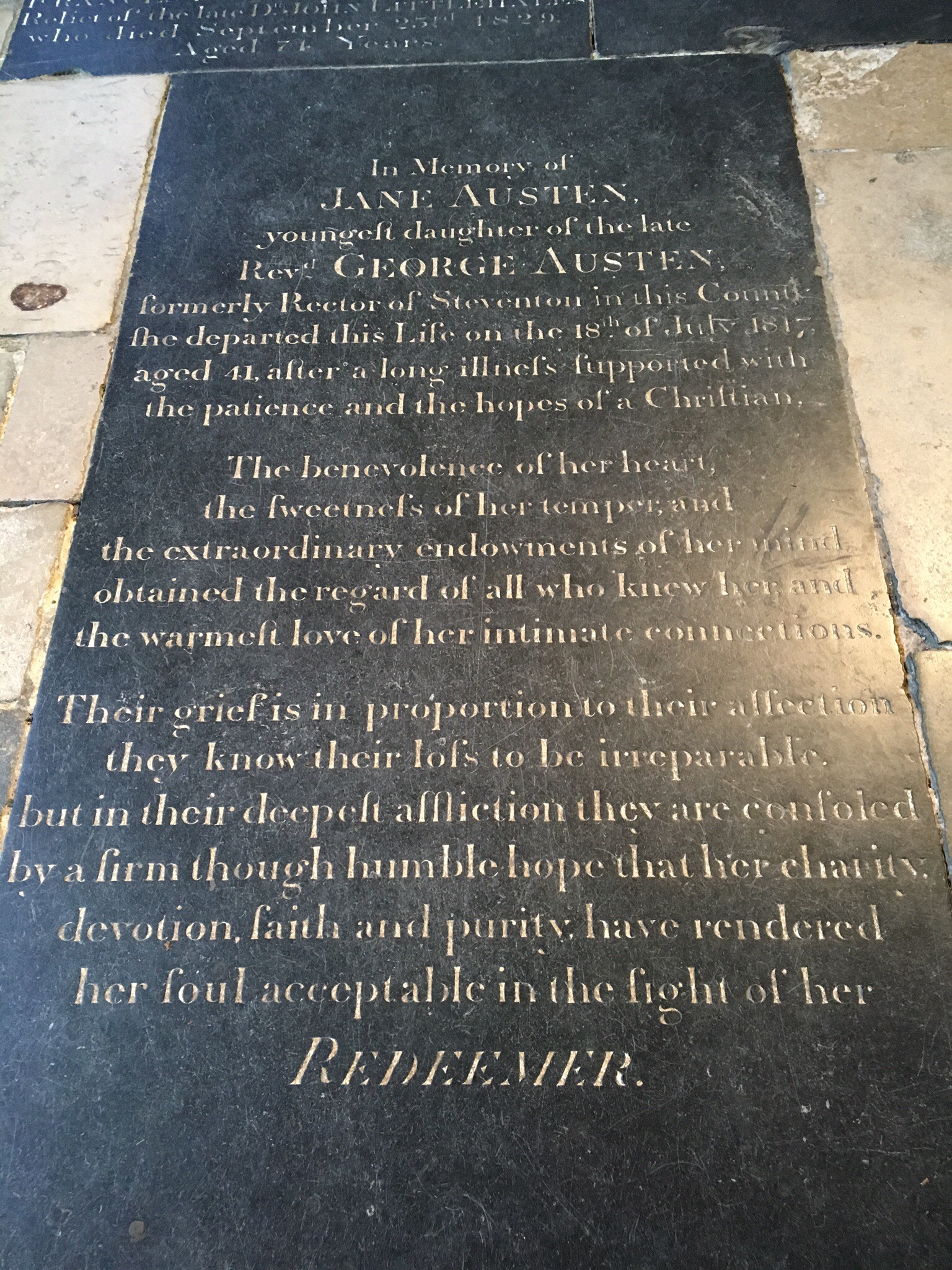Das Grab von Jane Austen, eine der großen englischen Klassiker der Literatur, die 1817 in Winchester starb, nur 41 Jahre alt.Die moderne Skulptur Sounds II des britischen Bildhauers Antony Gormley in der Krypta aus der ersten Bauphase der Kathedrale. Wenn es heftig regnet, steht die Statue bis zu den Knien im Wasser.The Great Screen aus dem 15. Jahrhundert hinter dem Altar, dessen reiche Verzierungen Graham Nashs Fantasie mächtig beeindrückt haben muss.Die mittelalterlichen Fliesen; man läuft auf einem Produkt, das vor 800 Jahren hergestellt wurde und immer noch gut aussieht.Die Büste für William Walker, einem Tiefseetaucher, der zu Beginn des 20. Jahrhunderts Tag für Tag, sechs Jahre lang an den Fundamenten der Kathedrale arbeitete und sie so vor dem drohenden Einsturz bewahrte.Die frühesten Glasfenster stammen aus den 1330ern. Viele, wie auch dieses, wurden im Civil War in den 1640ern zerstört. Die Scherben wurden eingesammelt und, schon damals ganz modern, mosaikartig wieder zusammengesetzt.