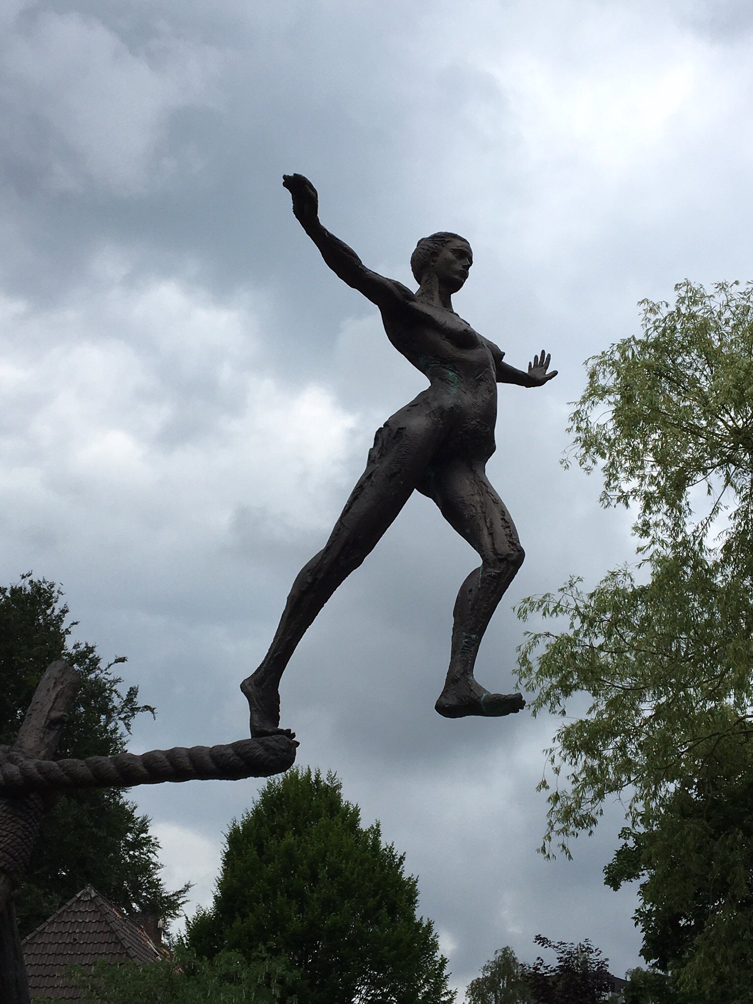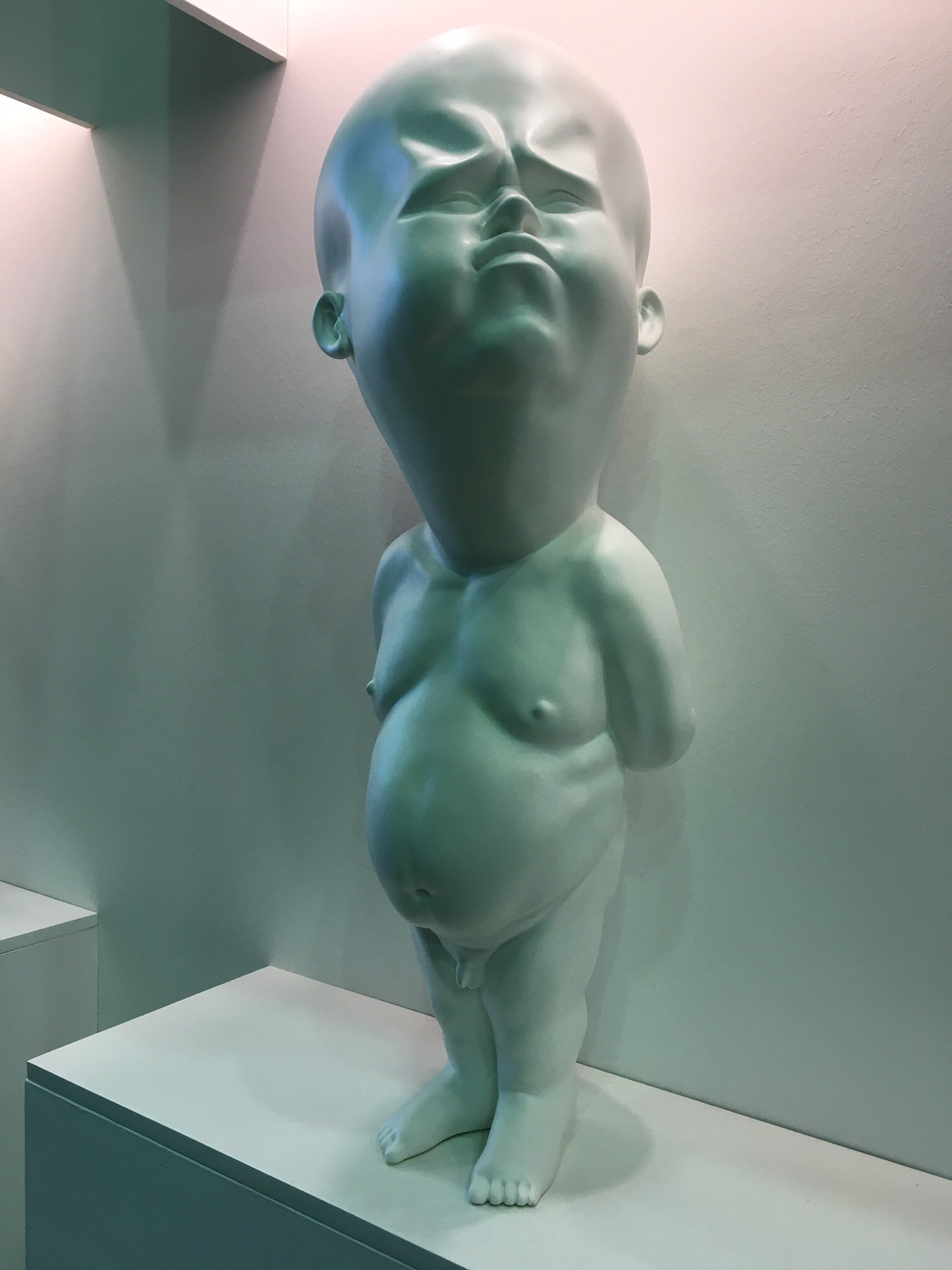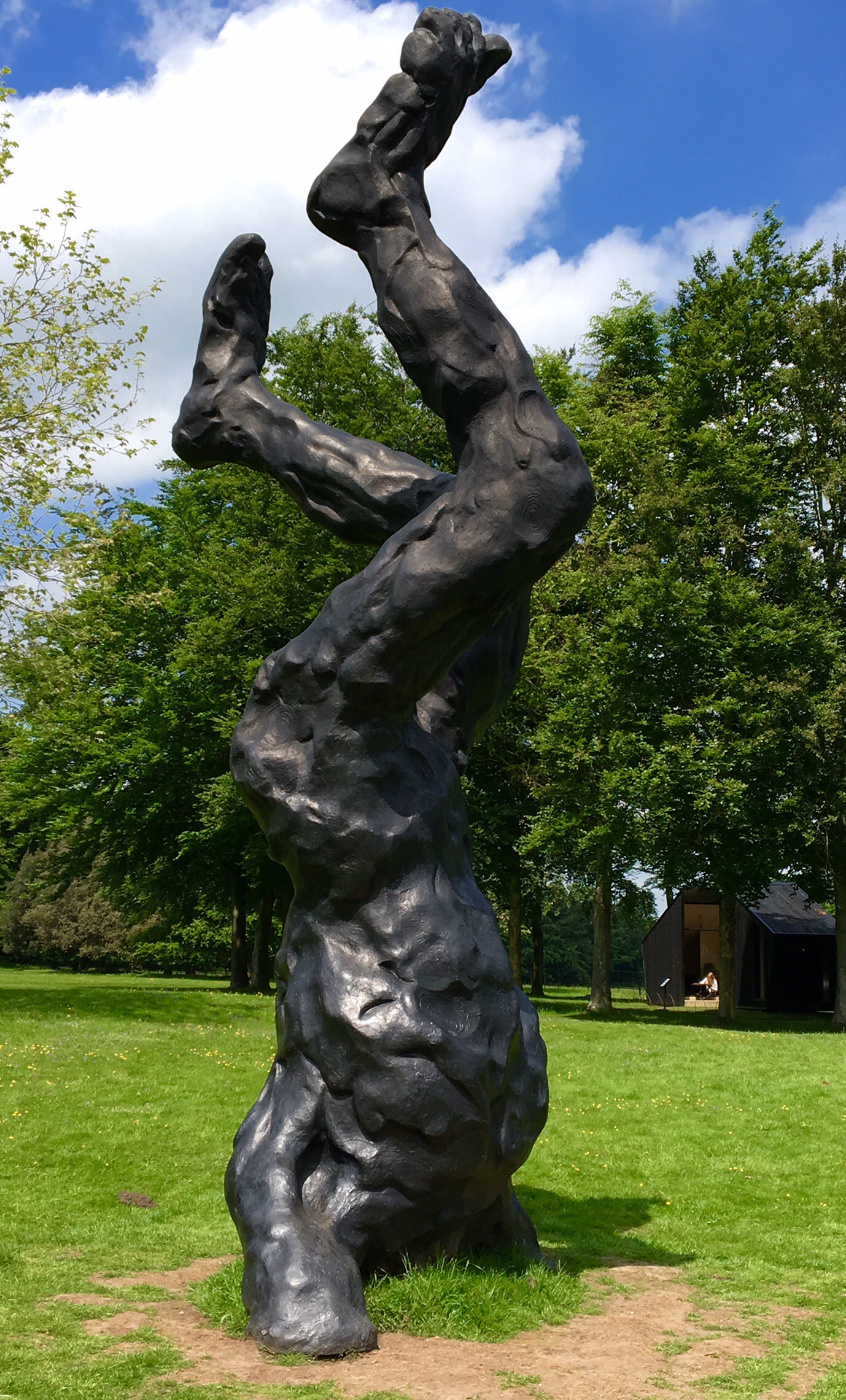 Zum anderen gibt es im oberen Stockwerk eine Kunstgalerie, in der wir schon tolle Sachen gesehen haben. Diesmal waren Zeichnungen von britischen Künstlern ausgestellt, die uns sehr angesprochen haben. Nicht so sehr die headliner, die Ausstellung heißt Drawings from Henry Moore to David Hockney, berühmte Namen, die das Publikum natürlich anziehen. Wir haben eher uns ungekannte Künstler entdeckt, können aber keine Fotos zeigen, da das Fotografieren nicht erlaubt war. Aber im Garten stand noch immer die monumentale Skulptur Alien von David Breuer-Weil, deren Entwurfsskizzen ebenfalls in der Ausstellung hingen.