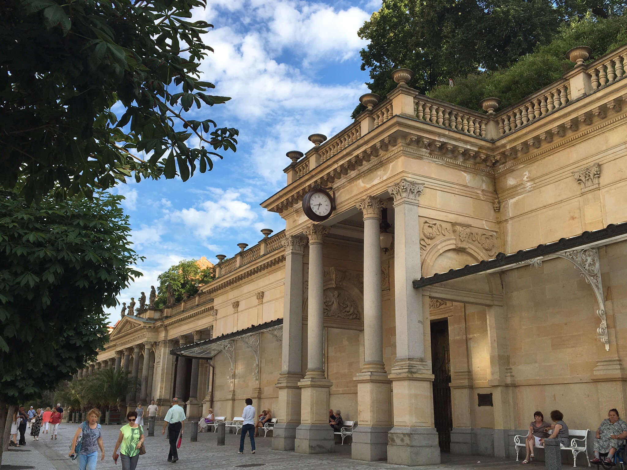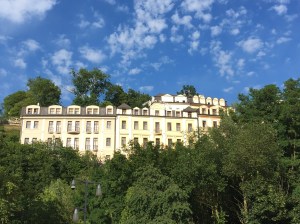 unser Hotel Jean de Carro, ab jetzt wird nur noch in regulären Betten geschlafen, wenn wir unterwegs sindHier bleiben wir jetzt für eine Woche, werden spazieren gehen in den umliegenden Wäldern, ein bisschen Kultur und das Essen genießen. Das berühmte Filmfestival ist leider gestern zuende gegangen, aber es gibt Kurkonzerte in den Kolonnaden, Kirchenkonzerte und Jazz in den großen Hotels. Und dann müssen wir ja regelmäßig zu den heißen Quellen, um das eisen- und salzhaltige Wasser zu trinken. Wir halten uns schließlich in einem berühmten Kurbad auf.