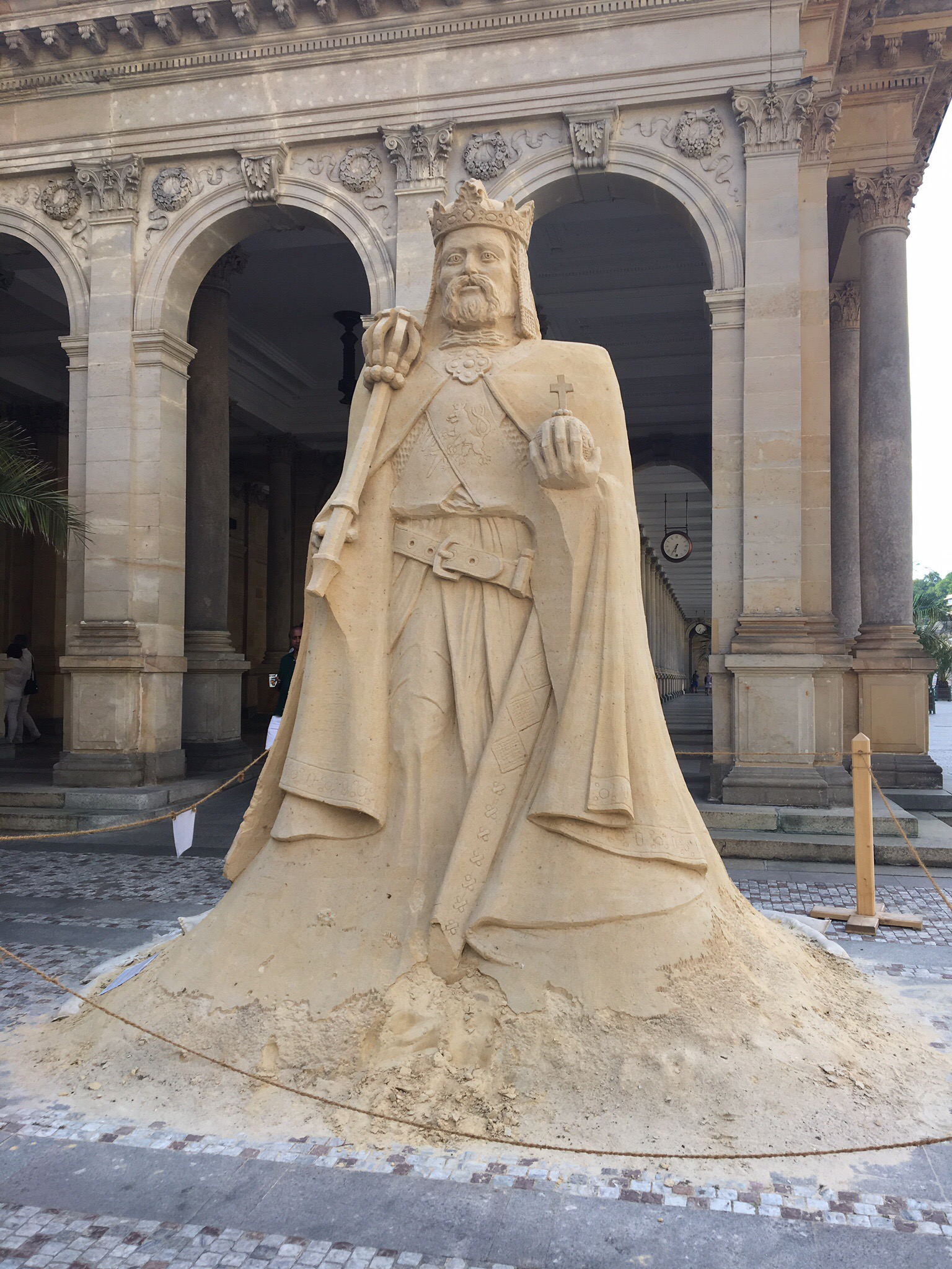 Karlsbad, Mühlenkolonnaden, James Bond lässt grüßenHier wird gerade der 700. Geburtstag von Karl IV, seines Zeichens böhmischer König (und auch König über so manch Nachbarland, bevor er zudem deutsch-römischer Kaiser wurde) gefeiert und das Kurgebiet hat sich hübsch heraus geputzt. Wir waren schon vor ein paar Jahren hier, allerdings im Herbst. Da war es sehr voll, viele ältere Menschen, die zum Kuren hierher kommen. Im Gegensatz dazu ist es jetzt gerade sehr übersichtlich bevölkert, sehr viele junge Menschen und Familien mit Kindern. In unserem Hotel oberhalb der Sprudelquelle sind wir fast allein. Jedenfalls waren wir die einzigen beim Abendessen, es wurde extra für uns gekocht. Dafür konnten wir aber auch nicht auswählen; gegessen wurde, was auf den Tisch kam: Käsesalat als Vorspeise, Hühnchen mit Schmorgemüse und Reis, Salat des Tages und zum Nachtisch mit Schokolade und Aprikosenmarmelade gefüllter Pfannkuchen mit Schlagsahne -kannst nicht meckern!
