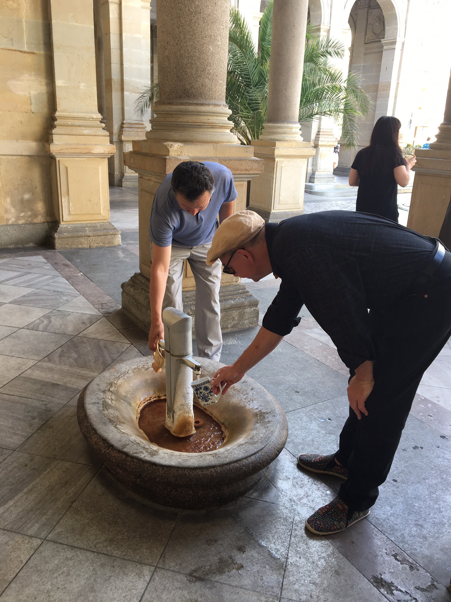 The pictures show a sculpture of Charles IV, the famous Mill Colonnades (as seen in the James Bond movie Casino Royale), our hotel and Kay, getting his portion of ‚good and healthy‘ hot water.