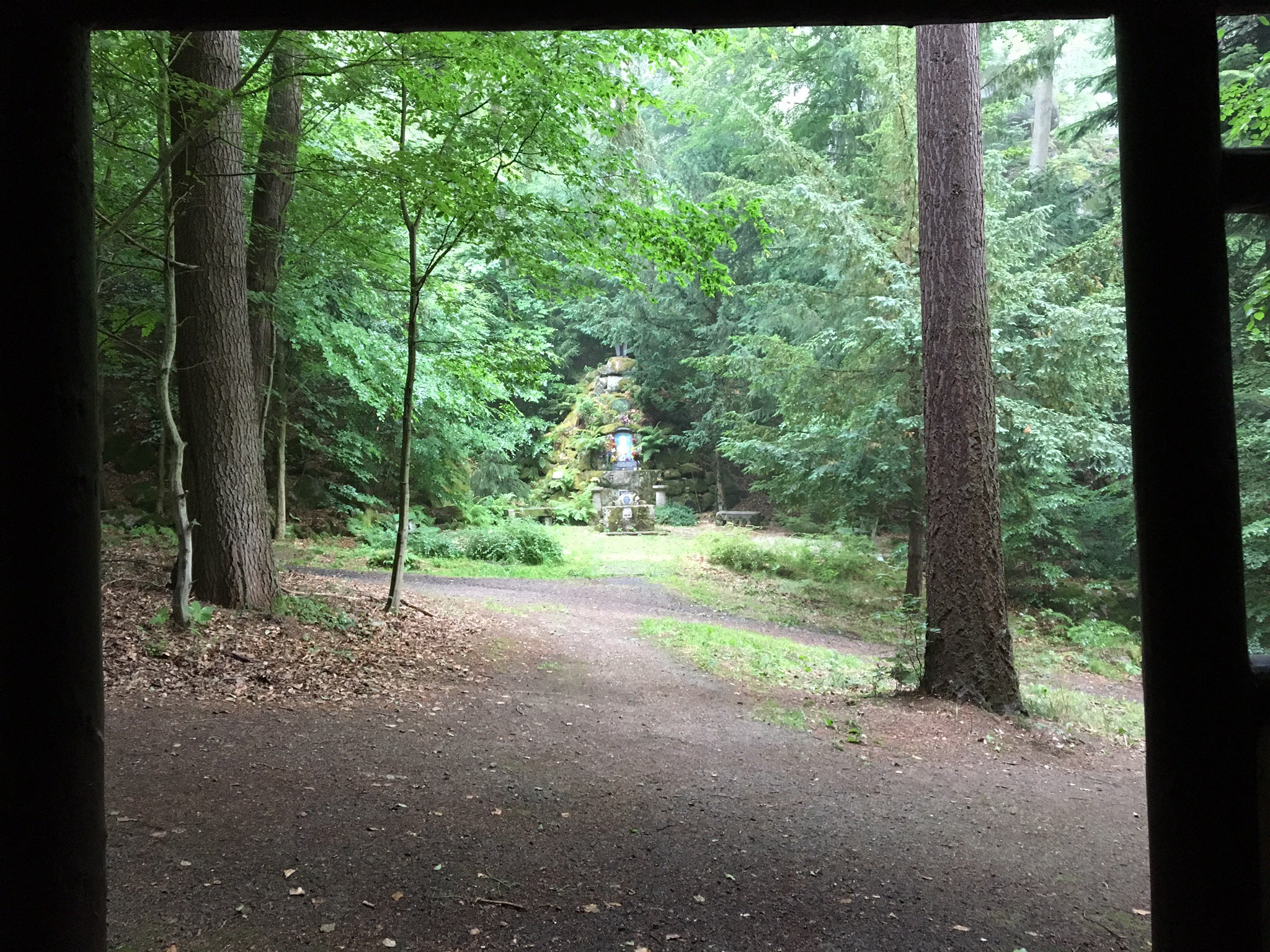Nach dem Temperatursturz von Montag mit 32 Grad auf heute mit nur noch 11 Grad mit Regen haben wir letzteren heute Vormittag im Hotel ausgesessen und lieber gelesen. Aber am Nachmittag war der Regen vorüber und wir brachen auf, mit Regenklamotten und Schirm bewaffnet, blieb aber alles im Rucksack, die Wolken hielten dicht. Auf dem Weg stetig bergan kamen wir an den Drei Kreuzen vorbei, die dort als Symbol der Re-Katholisierung schon seit ungefähr 375 Jahren stehen, allen Zeitläuften zum Trotz.