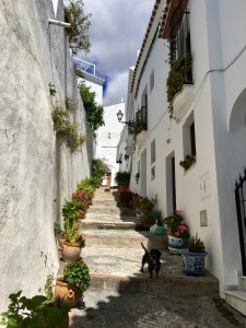 Anschließend geht es weiter in die Berge, immer am Rande des Nationalparks der Sierras von Tejeda, Almijara und Almara entlang. Dieser westliche Teil, auch bekannt unter dem Namen Axarquía, besticht durch viele kleine Dörfer inmitten von terrassenförmig angelegten Obst- und Gemüsegärten (jetzt gerade blühen die Avocadobäume). Eines wollen wir genauer erkunden. So fahren wir nach Cómpeta hinein. Irgendwo gibt es einen schönen Vorplatz an der örtlichen Kirche, also hinein in die schmalen Gassen. Leider fahren wir ohne Navi und biegen eher auf Verdacht ab. So landen wir schließlich an einer Mauer, von der im 90-Grad-Winkel eine Gasse und eine Treppe abbiegen, beide weniger als zwei Meter breit.