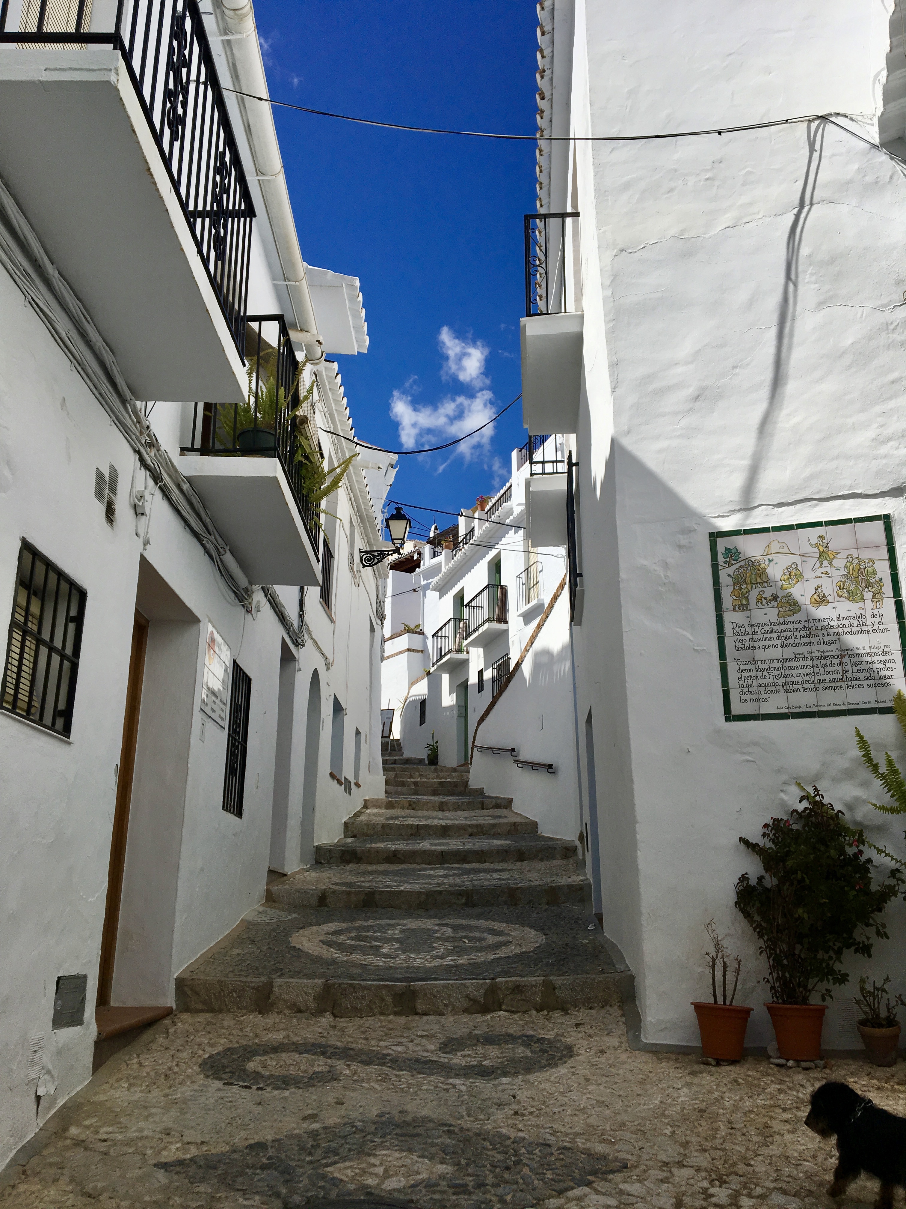 Wir starten in Frigiliana, einem außerordentlich hübschen Bergdorf mit schmalen Gassen nur für Fußgänger in der Altstadt. Das Auto wird man auf einem der vielen Parkplätze gut los. Dann geht es treppenweise immer höher hinaus, bis wir schließlich an einem Aussichtspunkt landen. Da noch nicht einmal Nebensaison ist, ist das Café leider noch geschlossen. Also noch ein Stückchen weiter, schon wieder bergab, bis zu einem Restaurant, dessen Küche zwar geschlossen hatte, das aber Getränke auf der Terrasse mit einer wunderbaren Aussicht über den Ort bis nach Nerja und das Mittelmeer serviert.