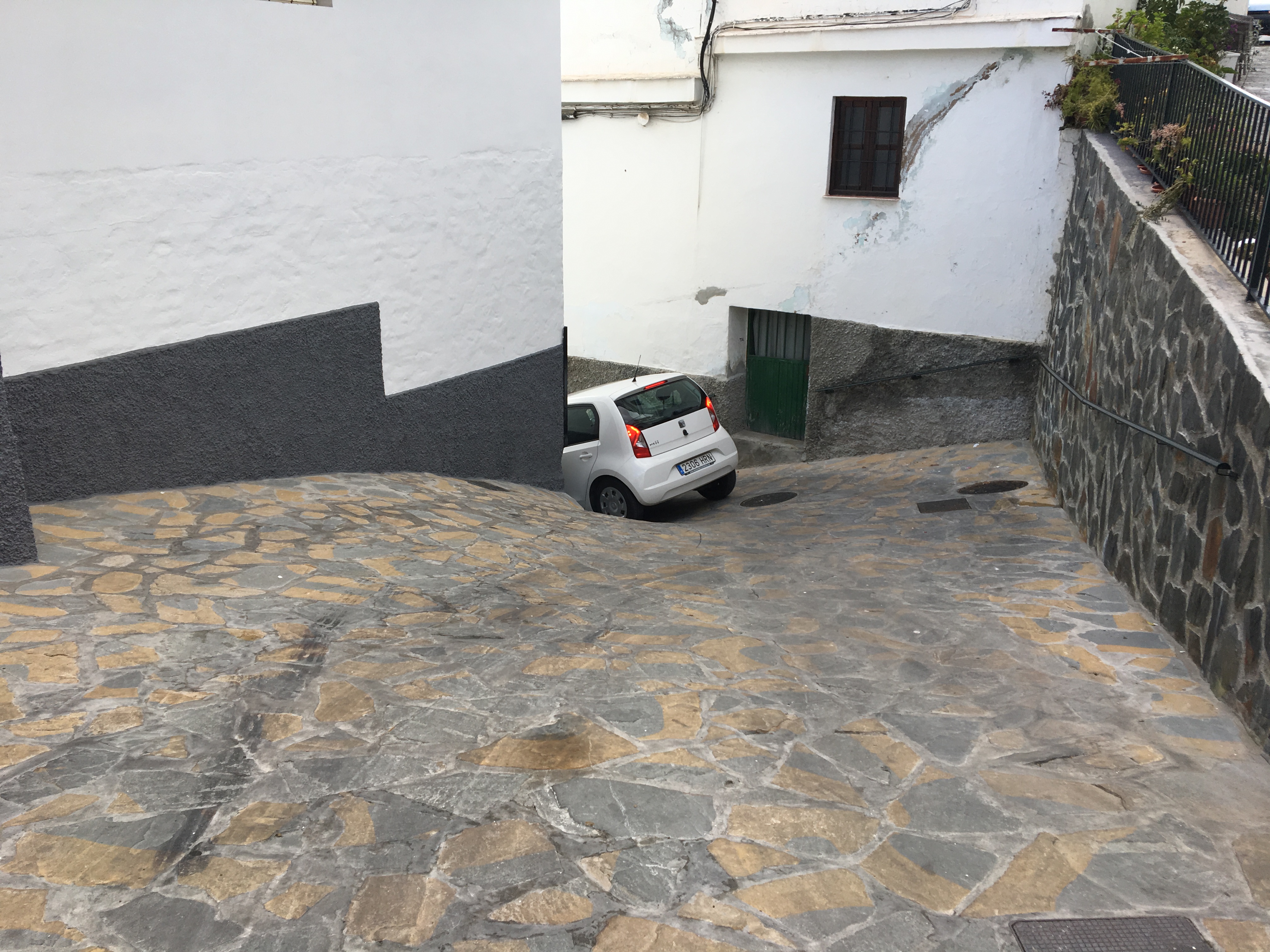 Unser Seat Mii ist nur 1,65 m breit, eine Passantin bestätigt, dass die Gasse schmal ist aber ‚posible’ ist. Aber trotz vielem Hin und Her würden wir nicht ohne Lackschaden an der metallverstärkten Hauskante vorbei kommen. Also rückwärts am Berg um fast 90 Grad zurückgestoppt und in die nächste Gasse hinein. Die endet in einer doppelten Haarnadelkurve, die gefühlt fast senkrecht in die Tiefe geht, natürlich auch wieder extrem schmal. Da stecken wir nun: hinunter trauen wir uns nicht, zurück gegen den Berg machen Kupplung, Auto und Fahrerin nicht mehr mit, die Handbremse ist kurz vor dem Versagen.