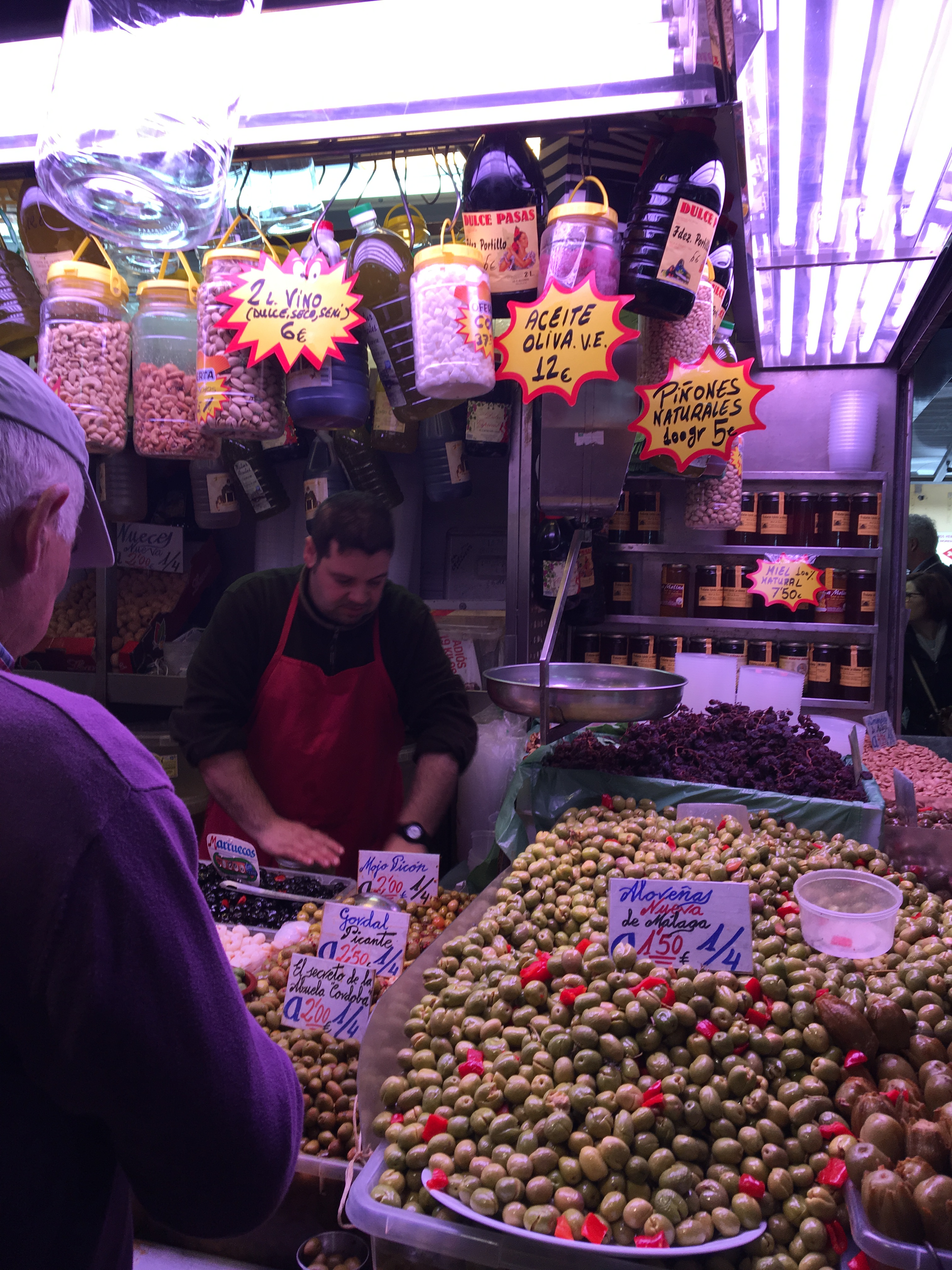 Unser Erkundungsgang in Málaga führt uns zunächst durch die älteste Weinstube am Platz. Hinter dem Tresen stehen große Fässer mit verschiedenen Weinen und ältere Herren in weißen Kitteln, die Weine in kleinen Gläsern an ältere Herren ausschenken, die vor dem Tresen stehen. Leider riecht es heute zu sehr nach Schwimmbad, sodass wir nur durchschlendern, um in der nahen Markthalle in das reichhaltige Angebot an Obst und Gemüse, Fisch, Fleisch und Geflügel einzutauchen. Die ersten Erdbeeren sind schon da, wir kaufen aber Nisperos (Japanische Wollmispel) zum Probieren, die kennen wir nicht, haben sie aber gestern in Frigiliana gesehen.