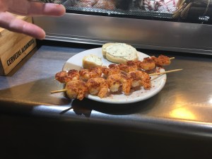 Dann finden wir einen Stand, an dem wir uns durch Oliven, Salzmandeln und kleine halbgetrocknete Feigen durchprobieren. Letztere kommen auch mit. Zum Abschluss gibt es noch leckere Scampi-Spieße, frisch zubereitet.