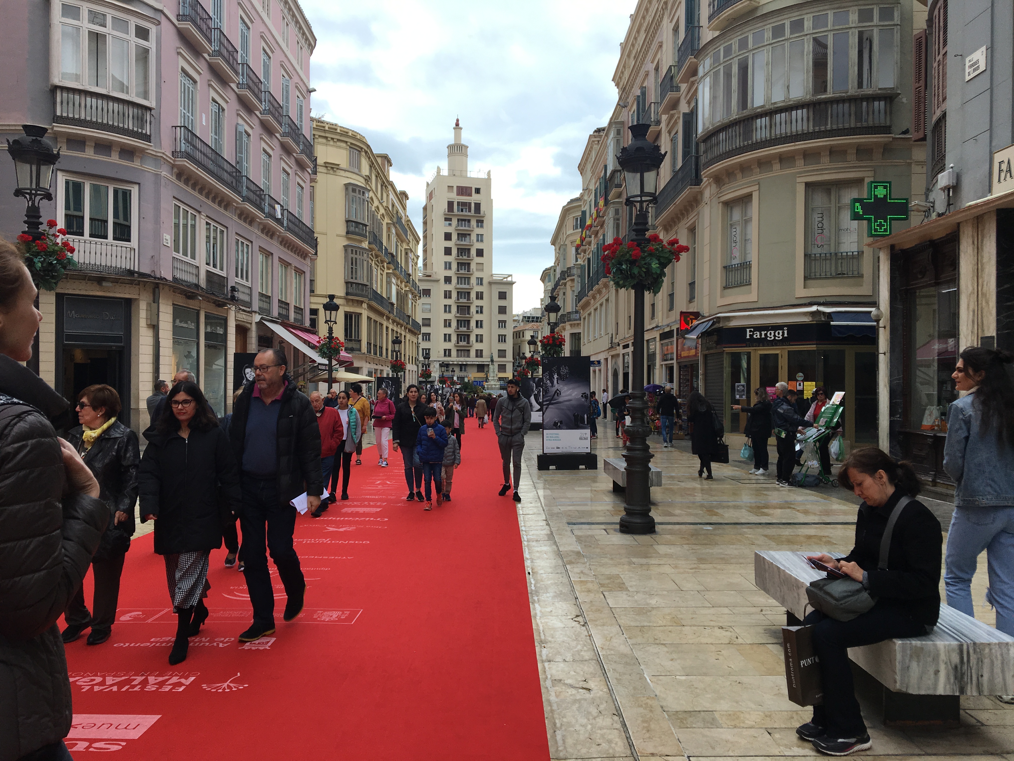 Auf der Haupteinkaufsstraße, der Calle Marqués de Larios ist für uns schon der rote Teppich ausgerollt. Die Farbe zusammen mit den cremefarbenen Hausfassaden durch die entsprechende Sonnenbrille betrachtet, lässt einen sofort gut drauf kommen! Der rote Teppich macht Werbung für das demnächst stattfindende Filmfest mit ausschließlich spanischen Filmen. Daher ist es nicht so schlimm, dass wir dann schon nicht mehr hier sein werden.