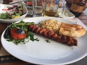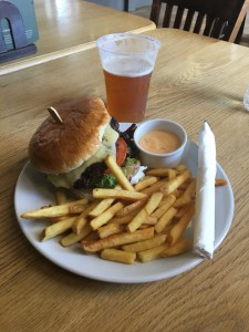 Und es gibt einen Pub, in dem wir uns bei einem pint IPA entspannen und das Abendessen aus Burger vom Angusrind und Chips mit Aussicht genießen.