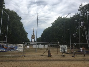 AusschnittsvergrößerungWassersäcke in der City, die die jungen Bäume in der Hitze nachhaltig wässern.Ein fliegendes Trapez in Knightsbridge, an dem man das Fliegen üben kann; aufgebaut auf dem Rasen neben dem Albert-Memorial. Das hätte Queen Victoria aber nicht erlaubt!!