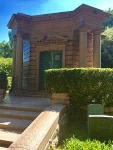 Die Gräber waren, je nach Lage, zum Teil sehr teuer. Das musste man sich erst einmal leisten können. Gleichzeitig sollte, nicht nur den Hinterbliebenden, sondern vielmehr der Gesellschaft und den Touristen, von denen es damals auf Friedhöfen schon sehr viele gab, gezeigt werden, zu was man es zu Lebzeiten gebracht hatte. Ein schönes Beispiel stellt die Familie Dalziel dar. Sie waren erfolgreiche Wollhändler und kauften sich eine Grabkammer in der renommierten Egyptian Avenue, die natürlich angemessen, mit all den anderen Kammern links und rechts bewundert wurde. Doch die Geschäfte liefen noch besser und das Bedürfnis wuchs, an prominenterer Stelle dafür bewundert zu werden. Also ließ man gleich am Eingang des 1860 eröffneten East Cemetery ein Mausoleum in ziemlich auffälligem rosafarbenen Stein erbauen.
