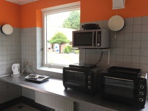 Die Abwaschküche ist nicht nur zum Abwaschen da, es gibt auch Kochplatten, Backöfen, einen Wasserkocher und man beachte das Waffeleisen auf der Mikrowelle. Undenkbar in den anderen Ländern, wäre schon längst geklaut worden.