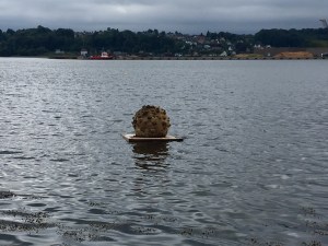 Flooded Modernity – die im Verhältnis 1:2 nachgebaute Villa Savoye von Le Corbusier, versenkt im Fjord.Vejle Svømmehal 1:2 – eine Kopie der Schwimmhalle, bei Hochwasser ist Zweidrittel des Objekts unter Wasser und verwischt bei Sonnenschein mit den Spiegelungen die Realitäten (ist beides bei unserem Besuch grad nicht available).Mycelium Moon – zwei Ökosysteme, die sich treffen: ein lebender Pilzorganismus trifft auf die Wasserwerk des Fjords mit einem unbestimmten, nicht vorhersagbaren Ergebnis.Papkasserne – drei schwimmende geschlossene Pappkartons, was mag sich da wohl drin befinden? Handgefertigt nach den Regeln des goldenen Rechtecks, überzogen mit Wachs und Latex und einem geheimen Inhalt.Objekt Uidentificeret – ein außerirdisches Objekt, das die komplexe Sprache der Seezeichen in sich vereint.Data Traveler – drei ‚Steine‘ (zumindest die äußere Schicht), eigentlich Abstraktionen von Stein, in sich gedreht/ gewendet/umgestülpt.
