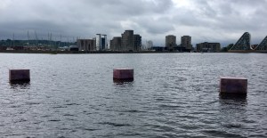 Der Campingplatz liegt nur ein paar Minuten (mit dem Rad) entfernt vom Fjord und dort, zwischen der Autobahnbrücke, die ihn überspannt, und dem neu entstehenden Stadtteil am Wasser, hat das Vejle Kunstmuseum in dieser Saison sozusagen eine Dependance. Bei der Floating Art 2018 zeigen elf junge Künstler und Architekten sehr unterschiedliche Werke zum Thema Wasser. Einige schauen wir uns von der Küste aus an (bevor der immer undurchsichtiger werdende Sprühregen uns stoppt: