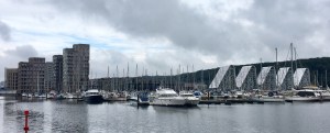 Bølgen (die Welle), neunstöckige Wohngebäude, die ersten drei Wellenkämme sind schon bewohnt, mit großartigem Ausblick auf den Fjord, entworfen von Henning Larsen Architects, rechts im Bild. Ganz links Havneøen, neun weitere, zum Teil noch im Bau befindliche Wohntürme im Hafenbecken mit Luxuswohnungen, einer umlaufenden Promenade und eigenem Hafenplatz. Und in der Bildmitte die neue Marina mit mehr als 600 Liegeplätzen, einem schwimmenden Kayak-Klubhaus (das dunkle Gebäude hinter den Yachten) und einer gezimmerten Insel davor.