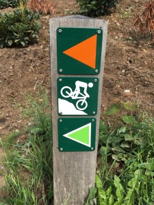 Der Weg wird durch orangene (Wanderer) und grüne (Radfahrer) Pfeile angezeigt und führt auf Schotterwegen, Waldwegen und auf Asphalt im Grunde immer in Schienen- und Flussnähe durch ein eiszeitlich geformtes Gletschertal. Manchmal laufen Wanderweg und Radweg getrennte Wege.